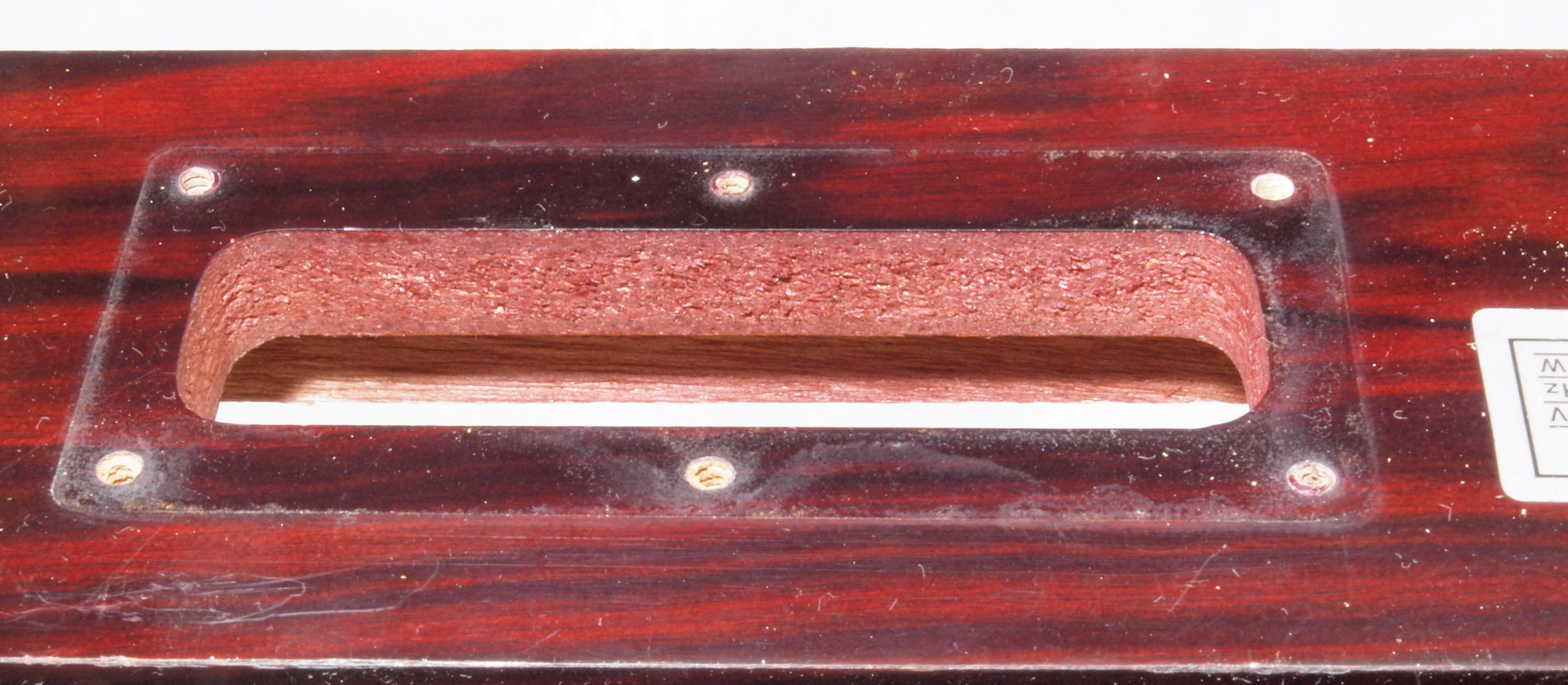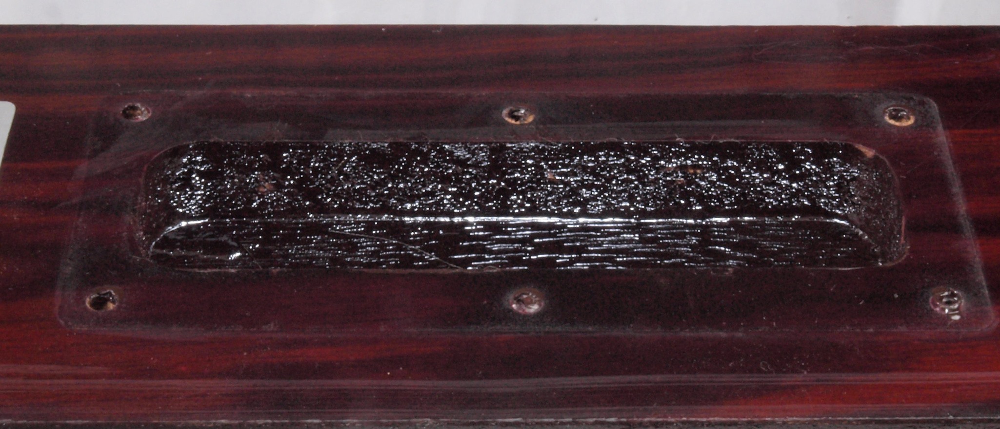| W. 下蓋及び本体木部 修理状況。 画像をクリックすると、大きく(横幅2050ドット)表示されます。 W11. 修理後 本体上から。 圧縮材にボンドを染みこませる、更にペンキを塗る。 |