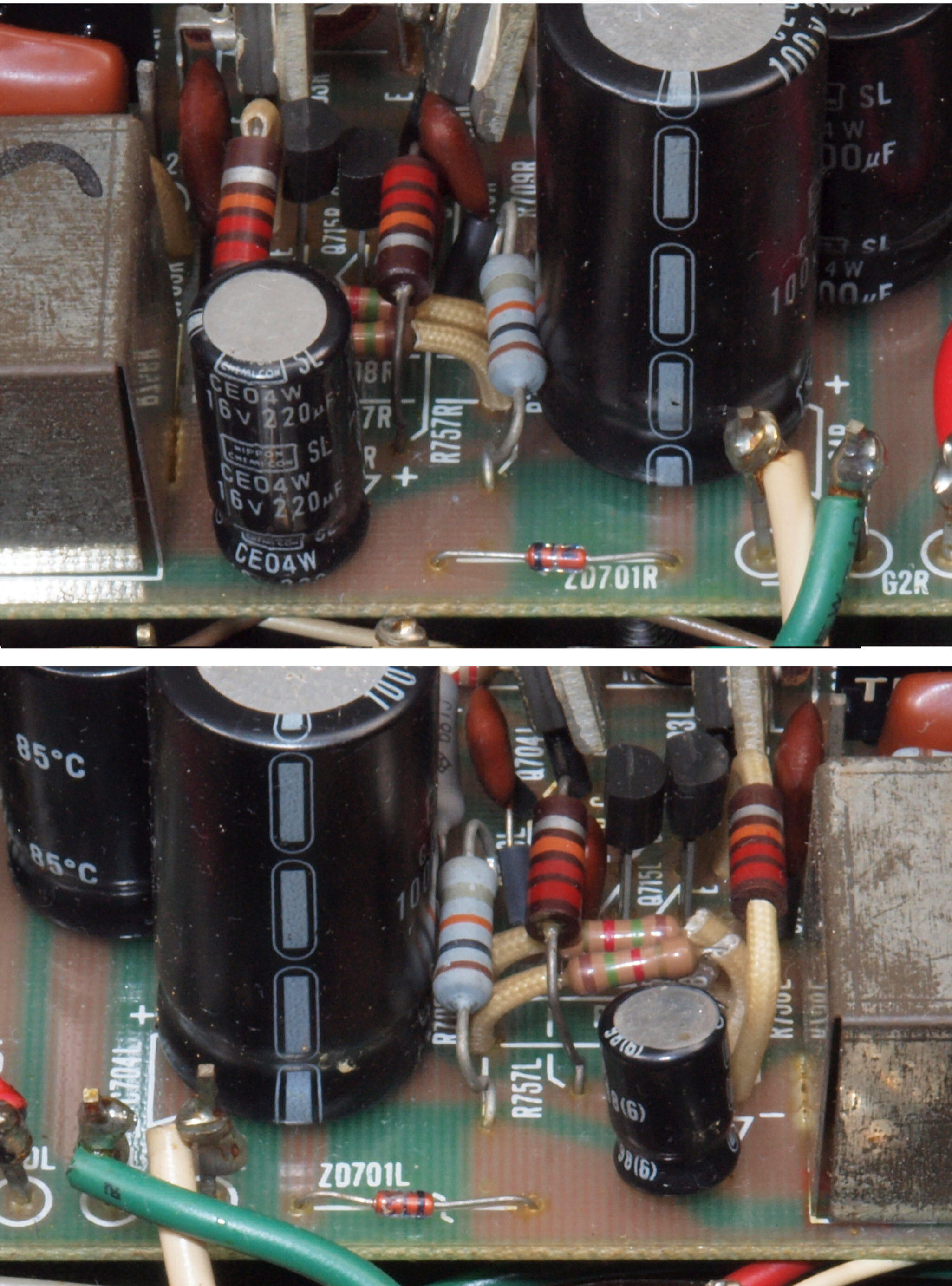 • 左右アンプ基板の電解コンデンサーが異なる! 製造時からか? 上=右側基板220μF/16V、上=左側基板47μF/25V。