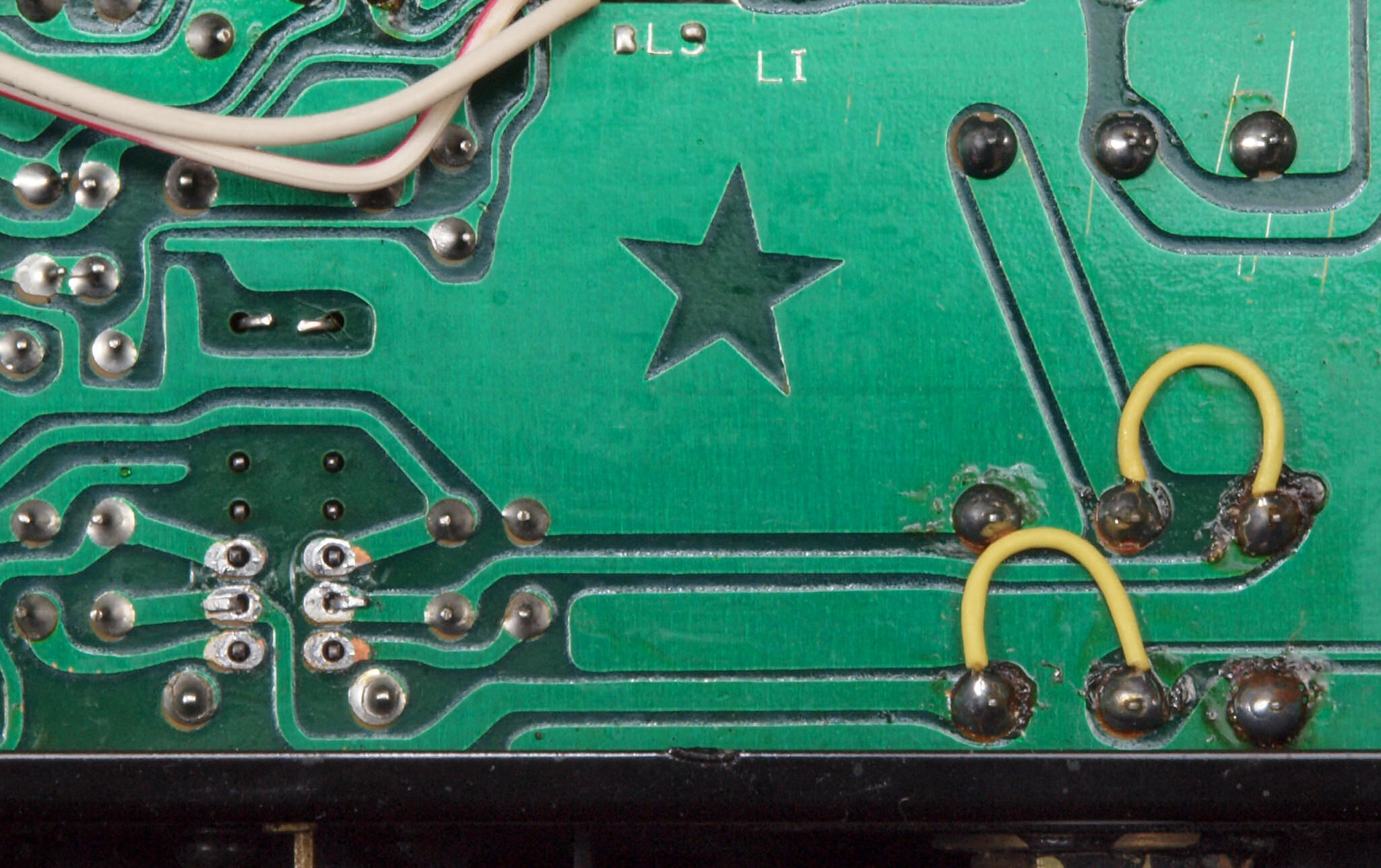 | B−2。 入力RCA端子基板裏。半田屑が2個残されている、今にも落ちそう。 | |