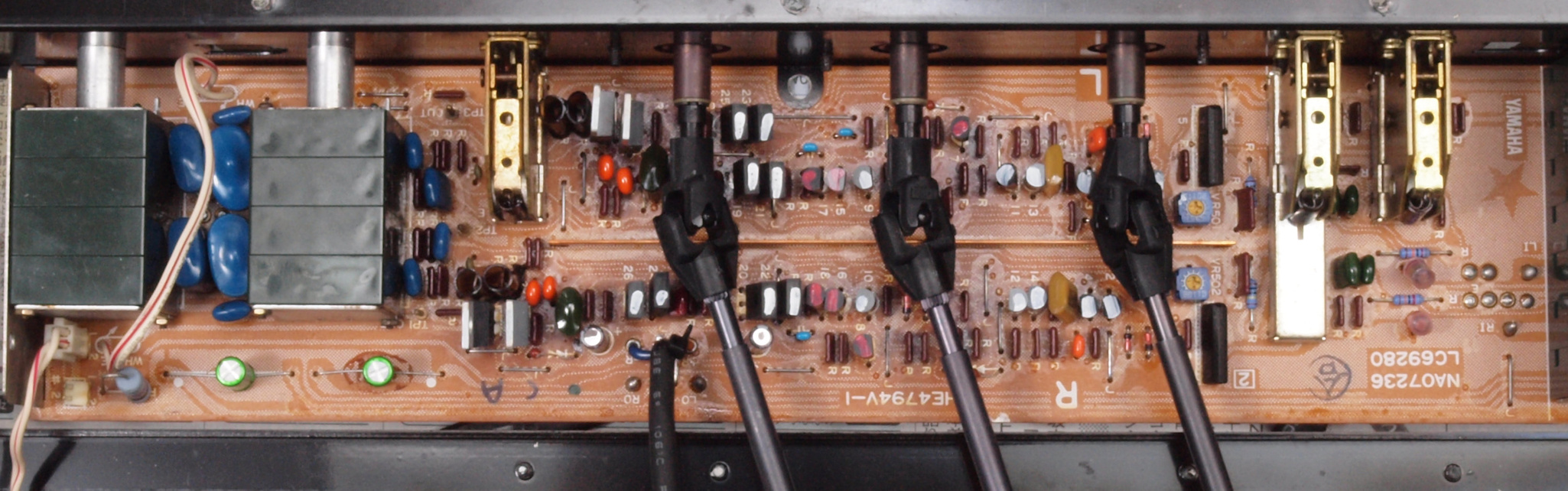 | A2A. 点検中 上下カバー、シールドを取り、下から見る。 トーンアンプ・ヤマハオリジナルの出力のフイルムコンデンサーが電解コンデンサーに交換されている。 | ||||||||||||||||||||||||||||||||||||||||||||||