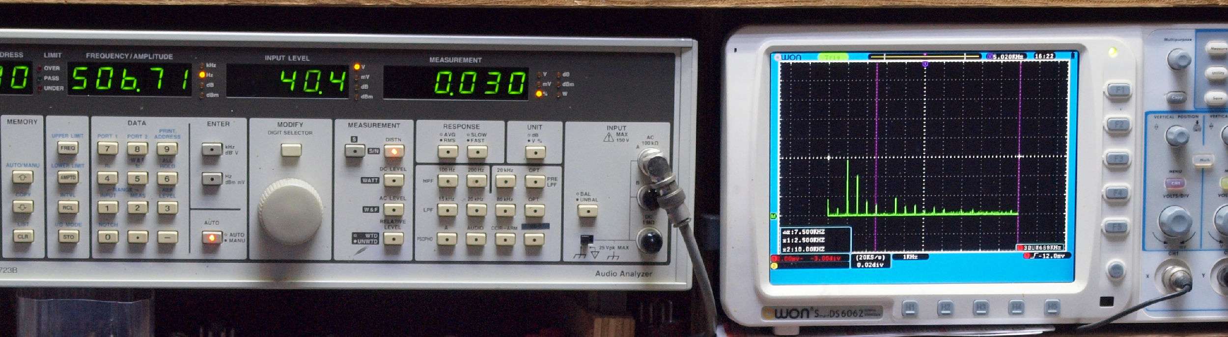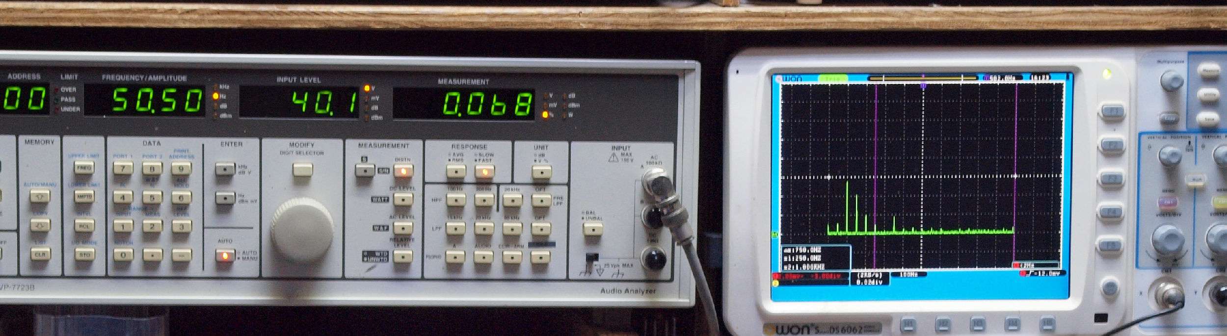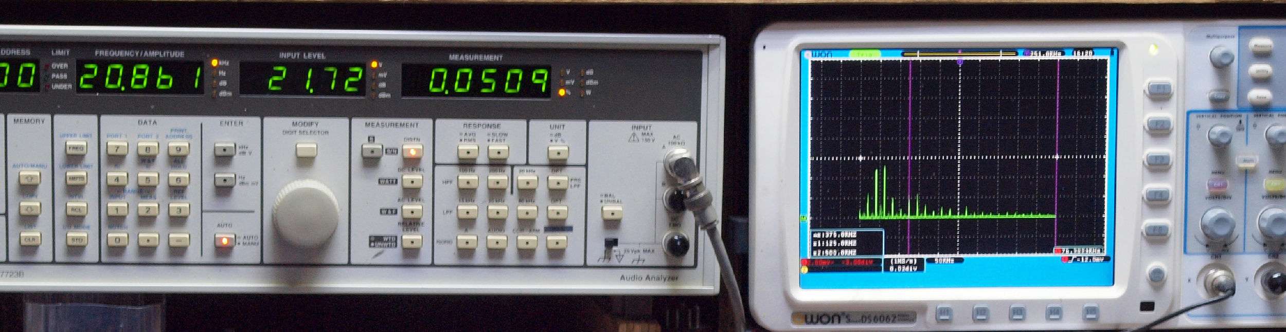 | F. 測定・調整。画像をクリックすると、大きく(横幅2050ドット)表示されます。 F1. 出力・歪み率測定・調整。片側のみ製作。 「見方」。 中左側SP出力を「Audio Analyzer Panasonic VP−7723B」により測定。 表示LED、 左端=メモリーNo、 中左=周波数測定、 中右=出力電圧測定、 右端=歪み率測定。 右端 VP−7723Bの基本波除去出力を「owon SDS6062(200MHZ)」で「FFT分析」表示。 左端 オーディオ発振器 VP−7201A より50Hz〜100kHzの信号を出し(歪み率=約0.003%)、ATT+分配器を通し、AMPに入力。 よって、ダイアル設定出力レベルより低くなります。測定機器の仕様や整備の様子はこちら、「VP−7723B」「VP−7201A」。 FFT画面の見方はこちら。 AMP左側は500W交流安定化電源。200W出力時で500VA入力。 |