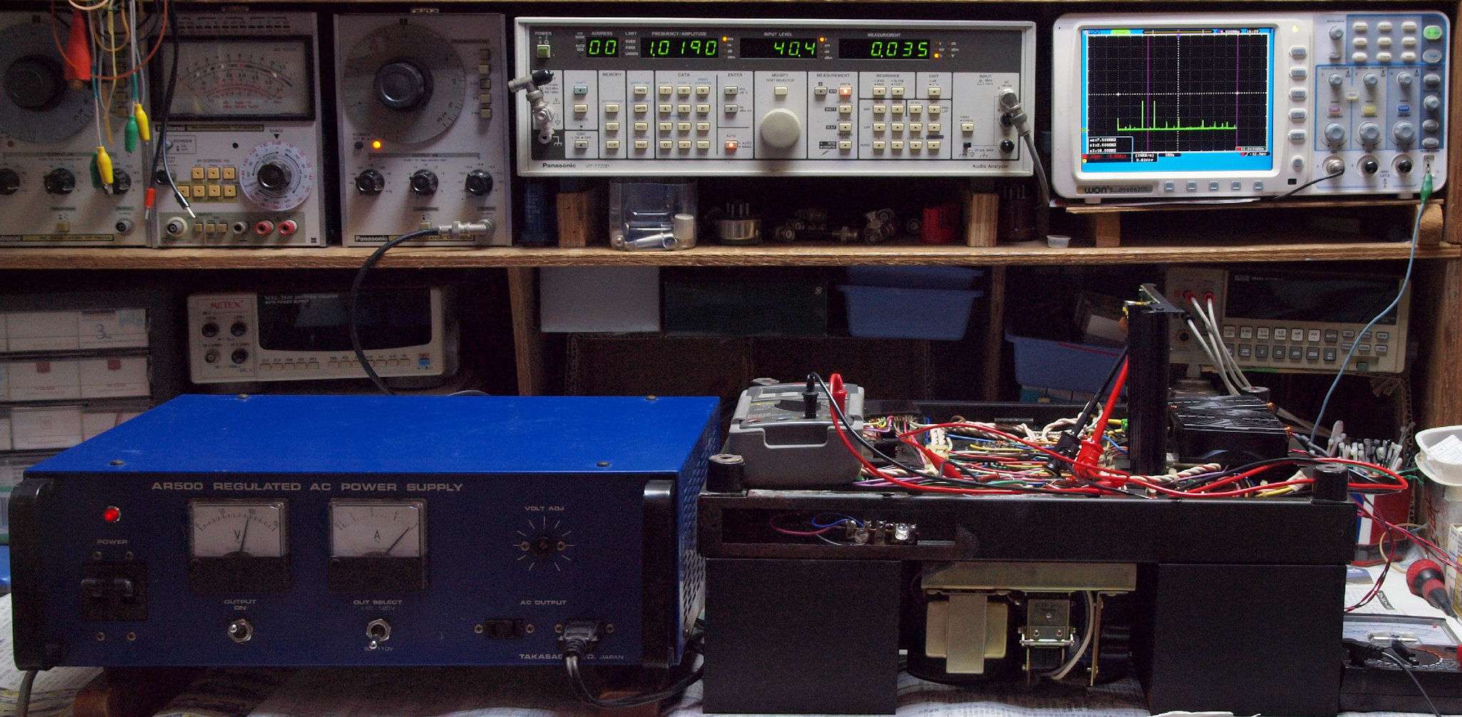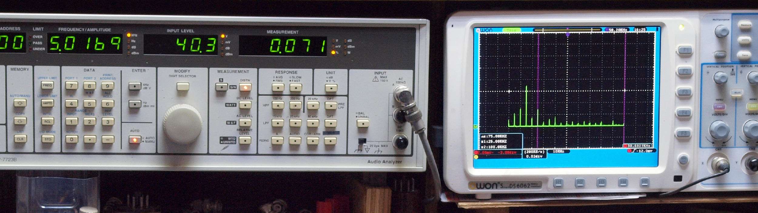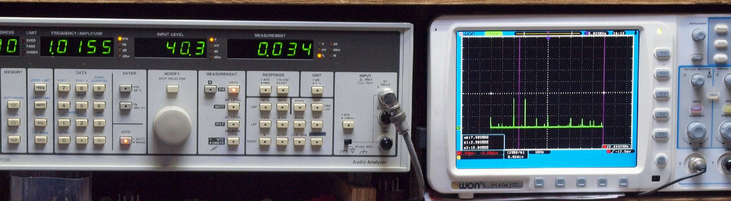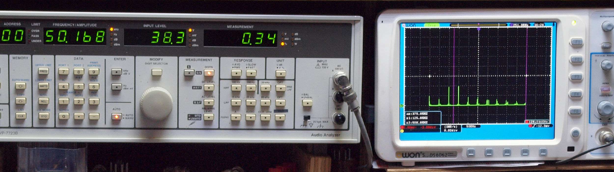 | F. 測定・調整。画像をクリックすると、大きく(横幅2050ドット)表示されます。 F1. 出力・歪み率測定・調整。片側のみ製作。 「見方」。 中左側SP出力を「Audio Analyzer Panasonic VP−7723B」により測定。 表示LED、 左端=メモリーNo、 中左=周波数測定、 中右=出力電圧測定、 右端=歪み率測定。 右端 VP−7723Bの基本波除去出力を「owon SDS6062(200MHZ)」で「FFT分析」表示。 左端 オーディオ発振器 VP−7201A より50Hz〜100kHzの信号を出し(歪み率=約0.003%)、ATT+分配器を通し、AMPに入力。 よって、ダイアル設定出力レベルより低くなります。測定機器の仕様や整備の様子はこちら、「VP−7723B」「VP−7201A」。 FFT画面の見方はこちら。 AMP左側は500W交流安定化電源。200W出力時で500VA入力。 |
