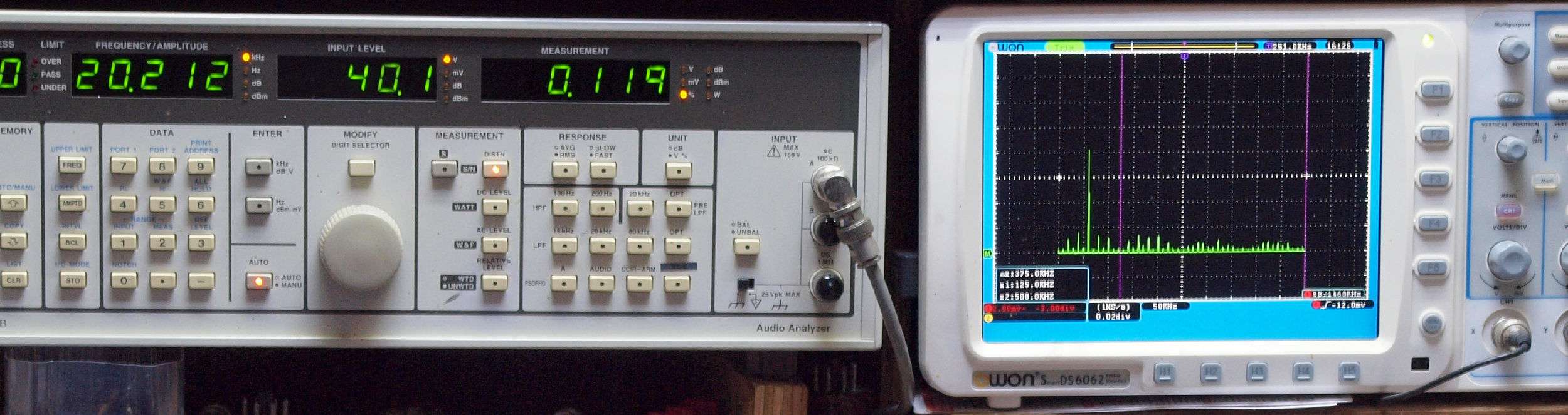 | E. 測定・調整。画像をクリックすると、大きく(横幅2050ドット)表示されます。 E1. 出力・歪み率測定・調整。片側のみ製作。 「見方」。 中左側SP出力を「Audio Analyzer Panasonic VP−7723B」により測定。 表示LED、 左端=メモリーNo、 中左=周波数測定、 中右=出力電圧測定、 右端=歪み率測定。 右端 VP−7723Bの基本波除去出力を「owon SDS6062(200MHZ)」で「FFT分析」表示。 左端 オーディオ発振器 VP−7201A より50Hz〜100kHzの信号を出し(歪み率=約0.003%)、ATT+分配器を通し、AMPに入力。 よって、ダイアル設定出力レベルより低くなります。測定機器の仕様や整備の様子はこちら、「VP−7723B」「VP−7201A」。 FFT画面の見方はこちら。 AMP左側は500W交流安定化電源。200W出力時で500VA入力。 |