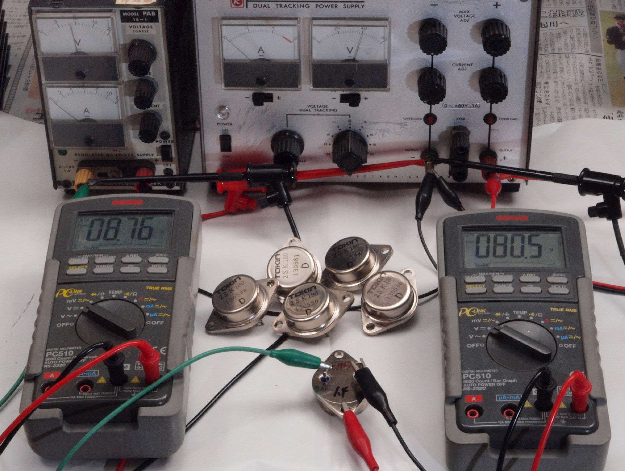 | A61. THF51s、Vp電圧測定(Vds=80V時)。 左=Vgs電源、右=Vds電源=80V固定、Vgs電圧を調節し、Ids=0の時を測定する。 |