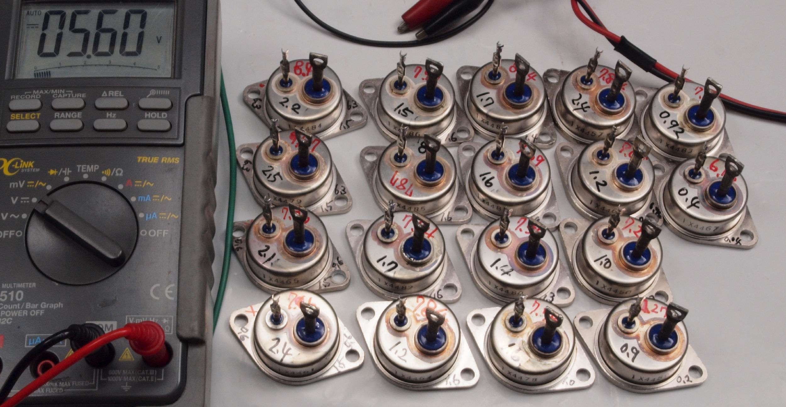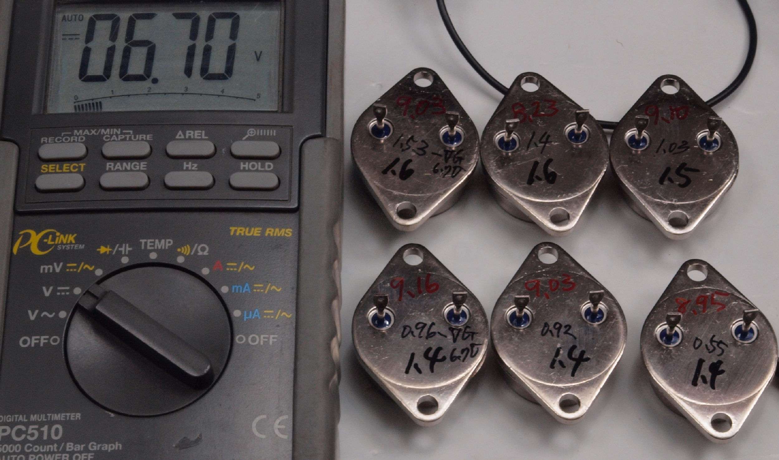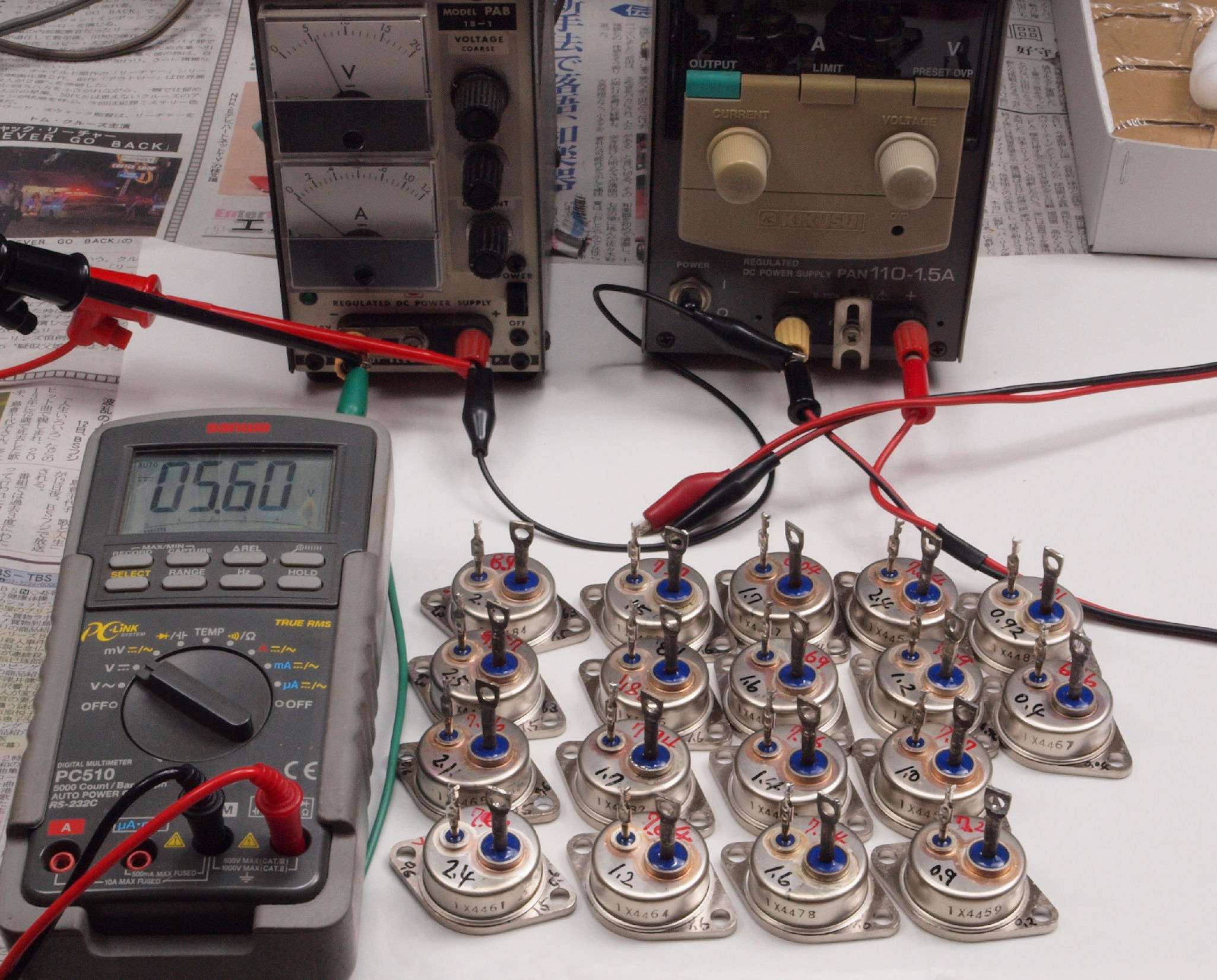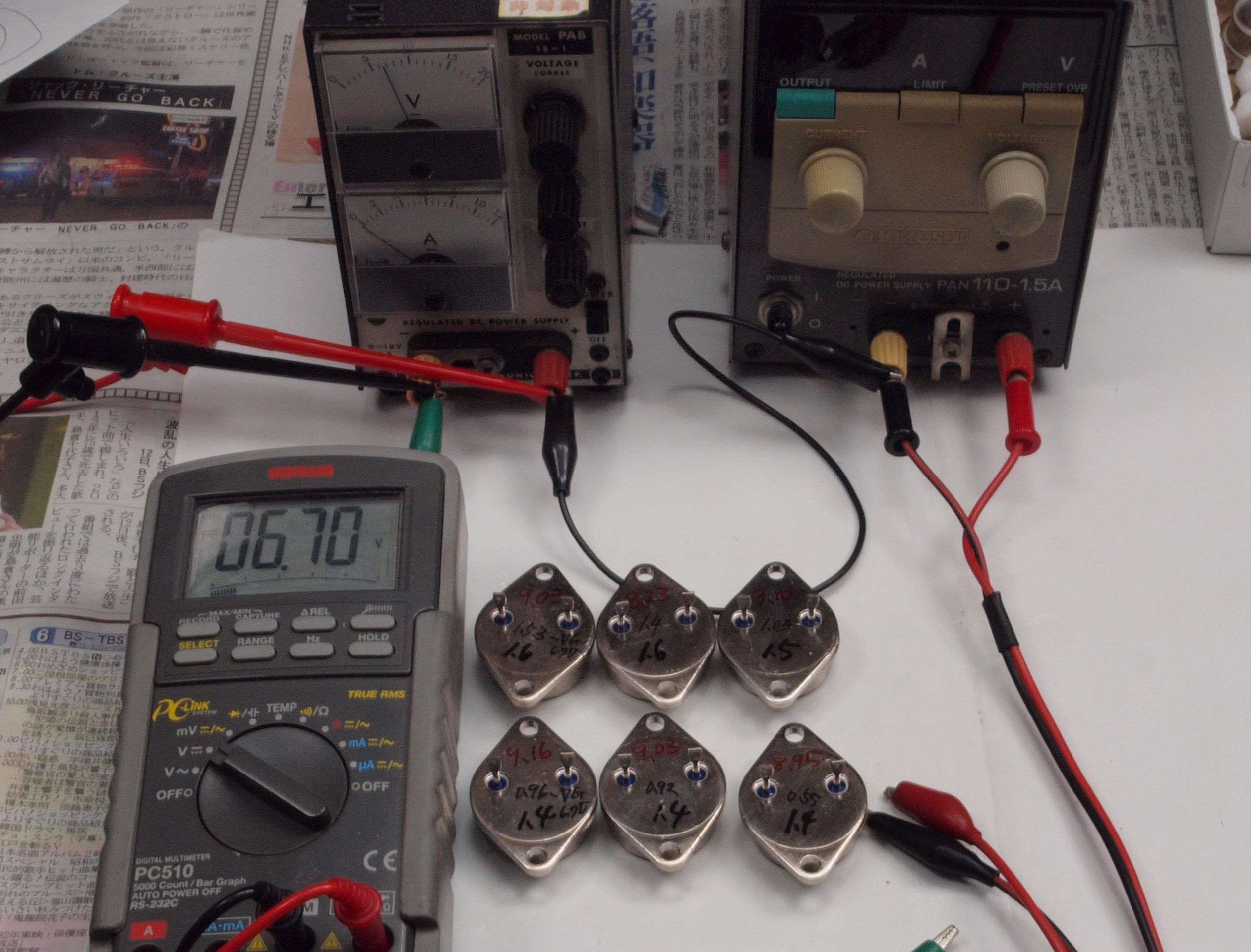| A63. 2SK77測定結果。赤い数字=Vp電圧(Vds=80V時)、大きいKい数字=Id電流(Vds=15V、Vgs=−2V時)。 小さいKい数字=Id電流(Vds=80V、Vgs=−6.7〜5.6V時)、左端4個はVgs=−6.7Vで測定。 |