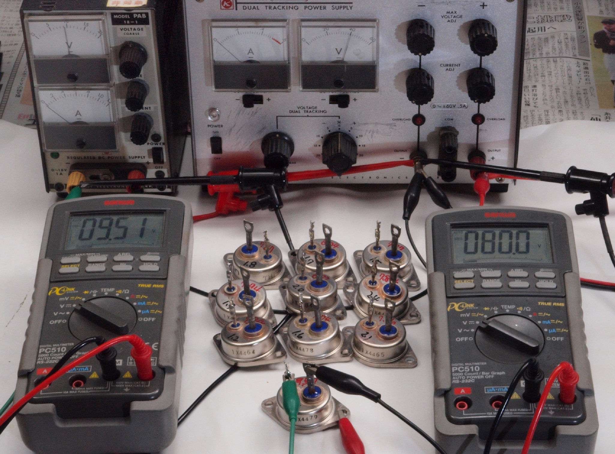 | A52. 2SK180、Id電流測定(Vds=80V、Vgs=−6.7V時) 左=Vgs電源=−6.7V固定、右=Vds電源、Vds電圧=80V固定、Idsを測定する。 |