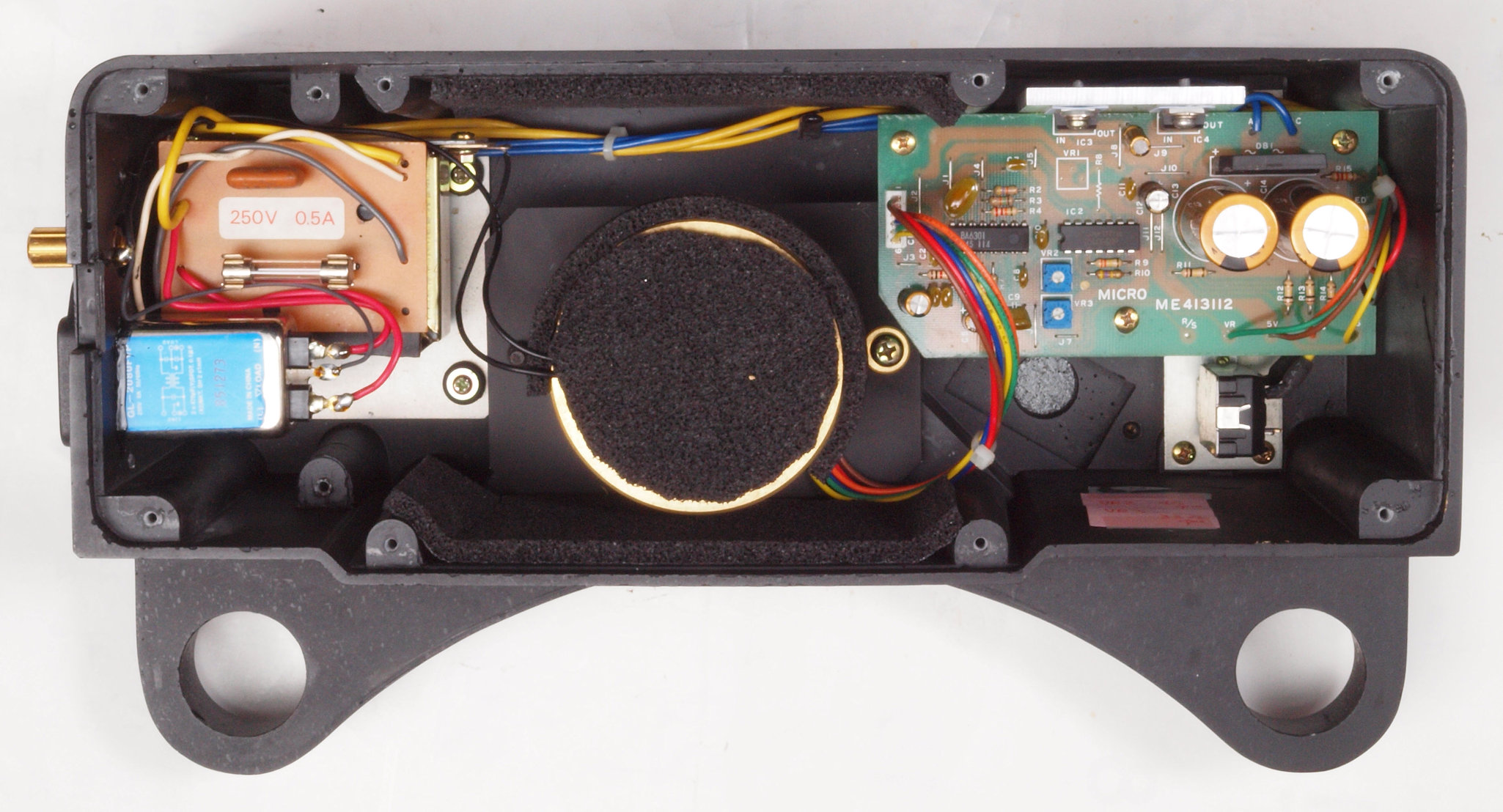 | A42. 点検中 下蓋を取り、下から見る。意味の解らないスポンジが貼ってある。電源コードがフイルター付3Pインレットに交換されている。 |