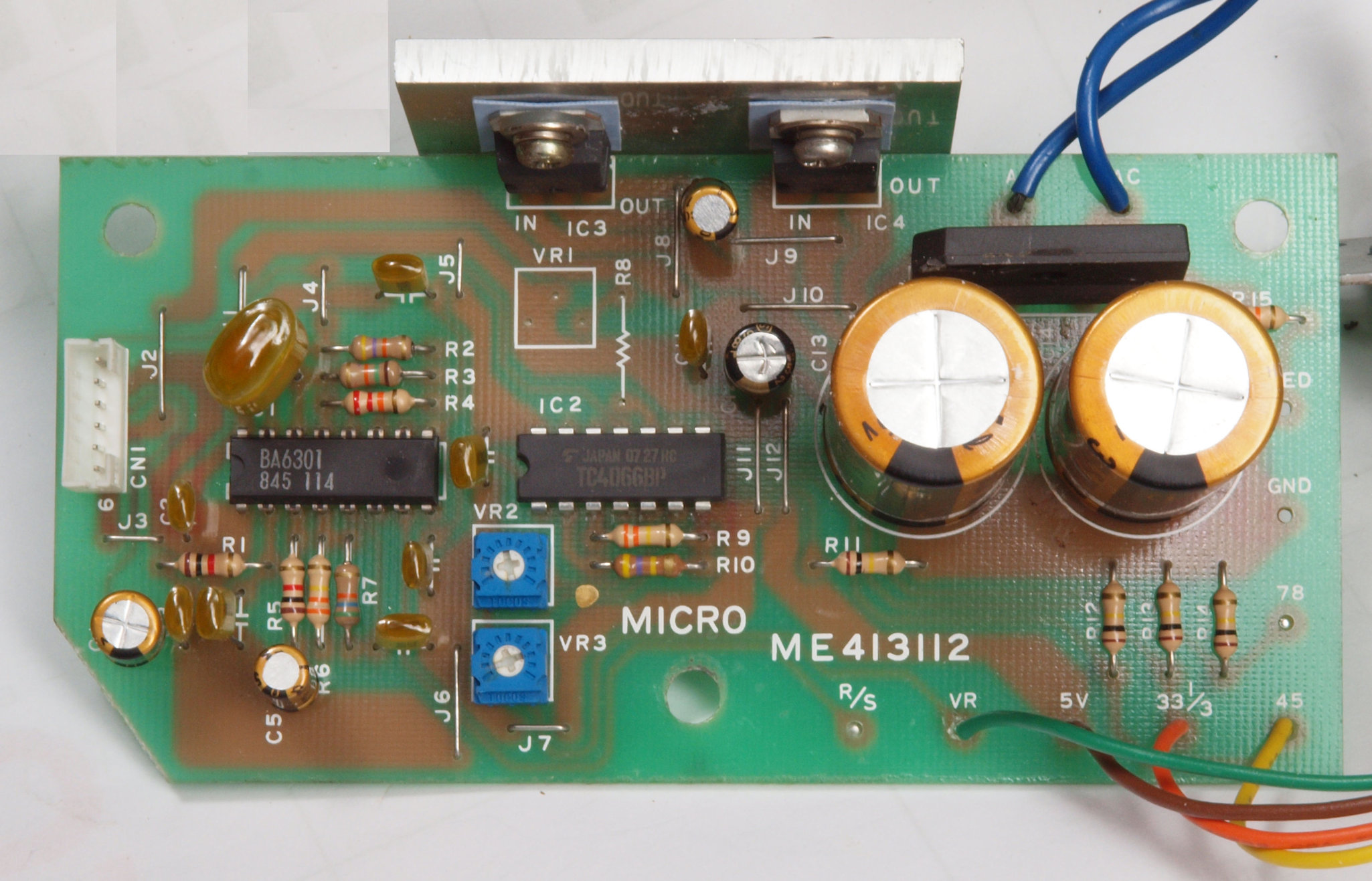 | C13. 修理後 モーター部コントロール基板。定電圧IC2個、放熱の良いシリコン絶縁シートに交換。 |