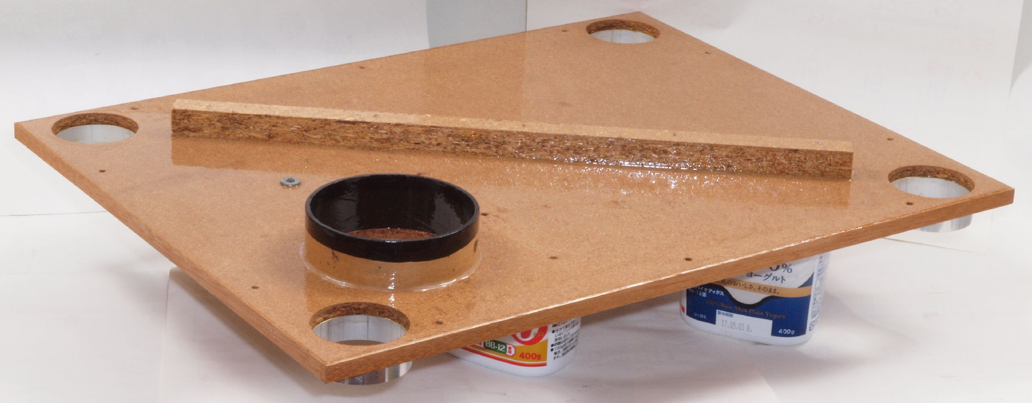 | W32. 修理中 プラッター軸受取付穴。 圧縮材にボンドを染みこませる、ネジ穴も塗る。 | ||||||||||||||||||||||||||||||