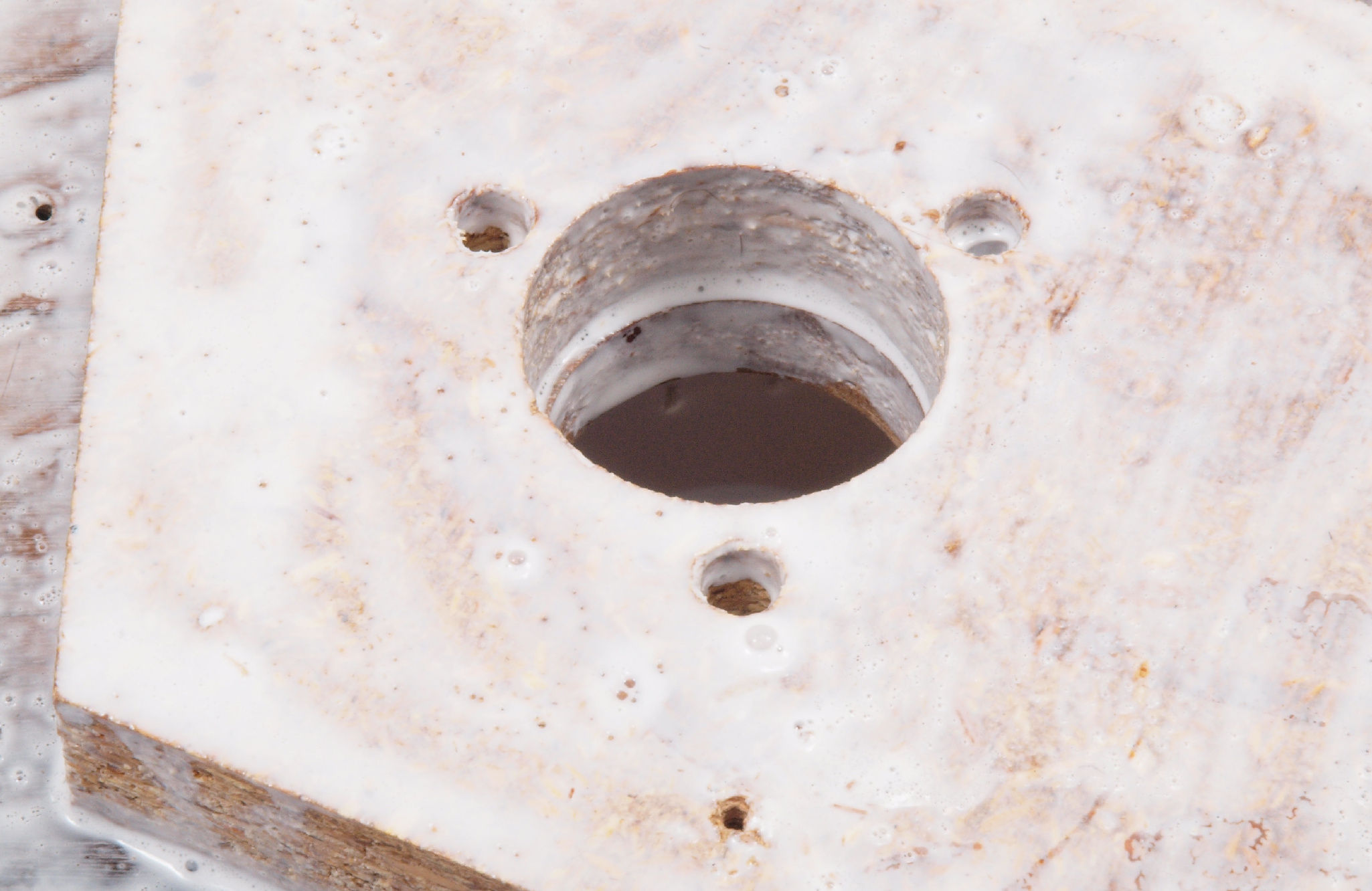 | W2B. 修理後 アーム取付穴表、反対側。 乾燥後さらにウレタン塗料を塗る。 | ||||||||||||||||||||||||||||||