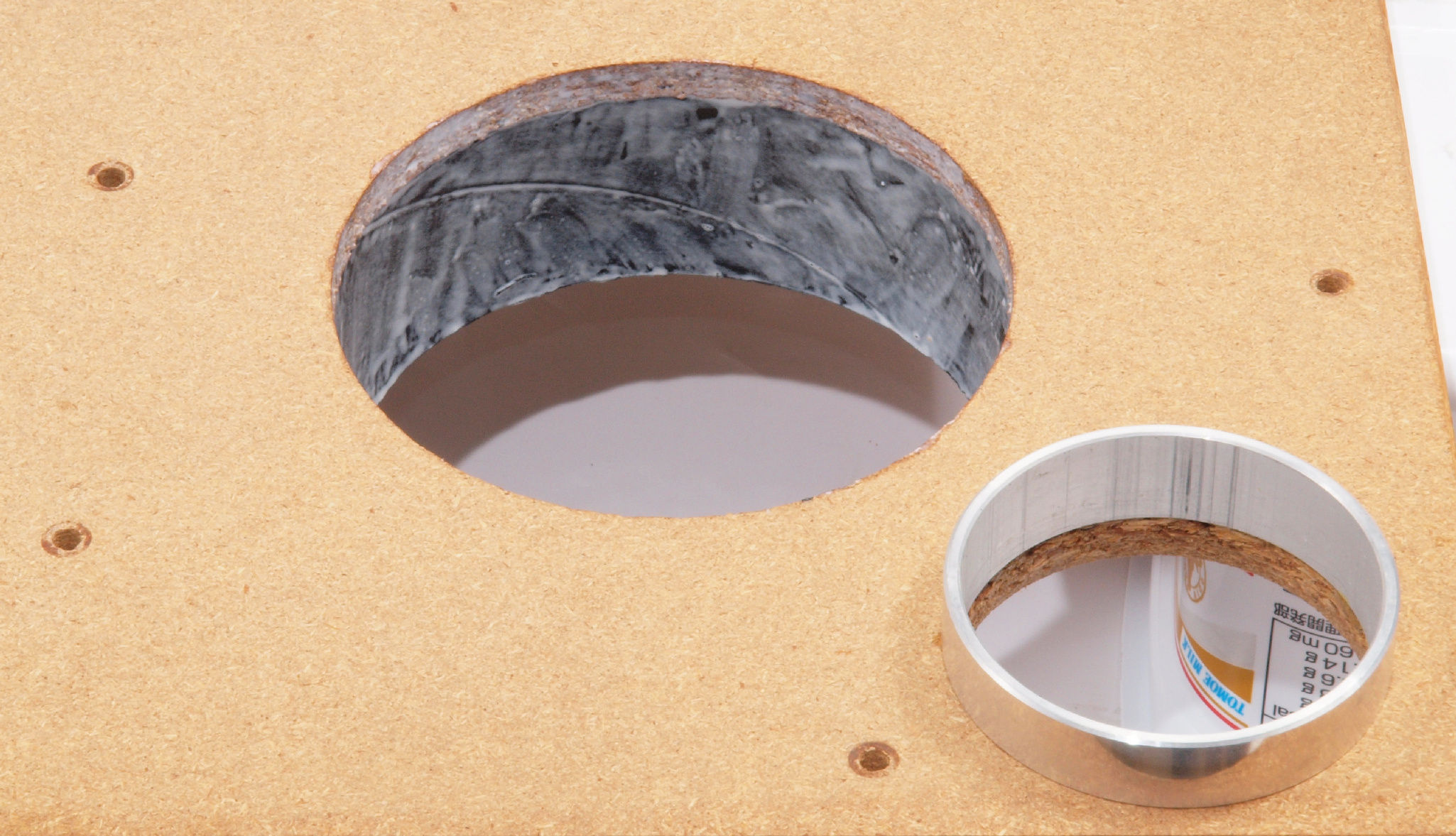 | W35. 修理中 プラッター軸受取付穴、反対側。 圧縮材にボンドを染みこませる、ネジ穴も塗る。 | ||||||||||||||||||||||||||||||