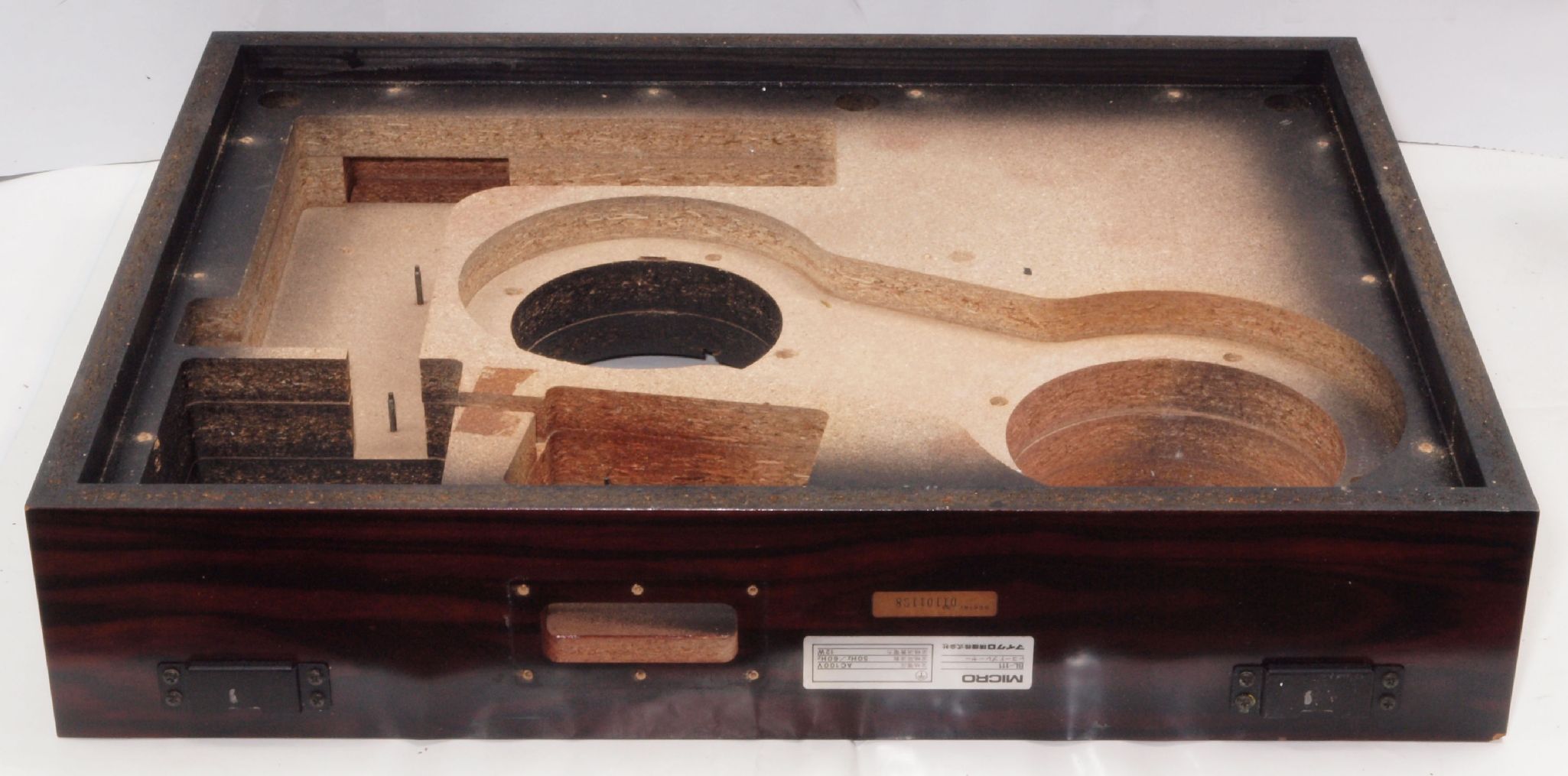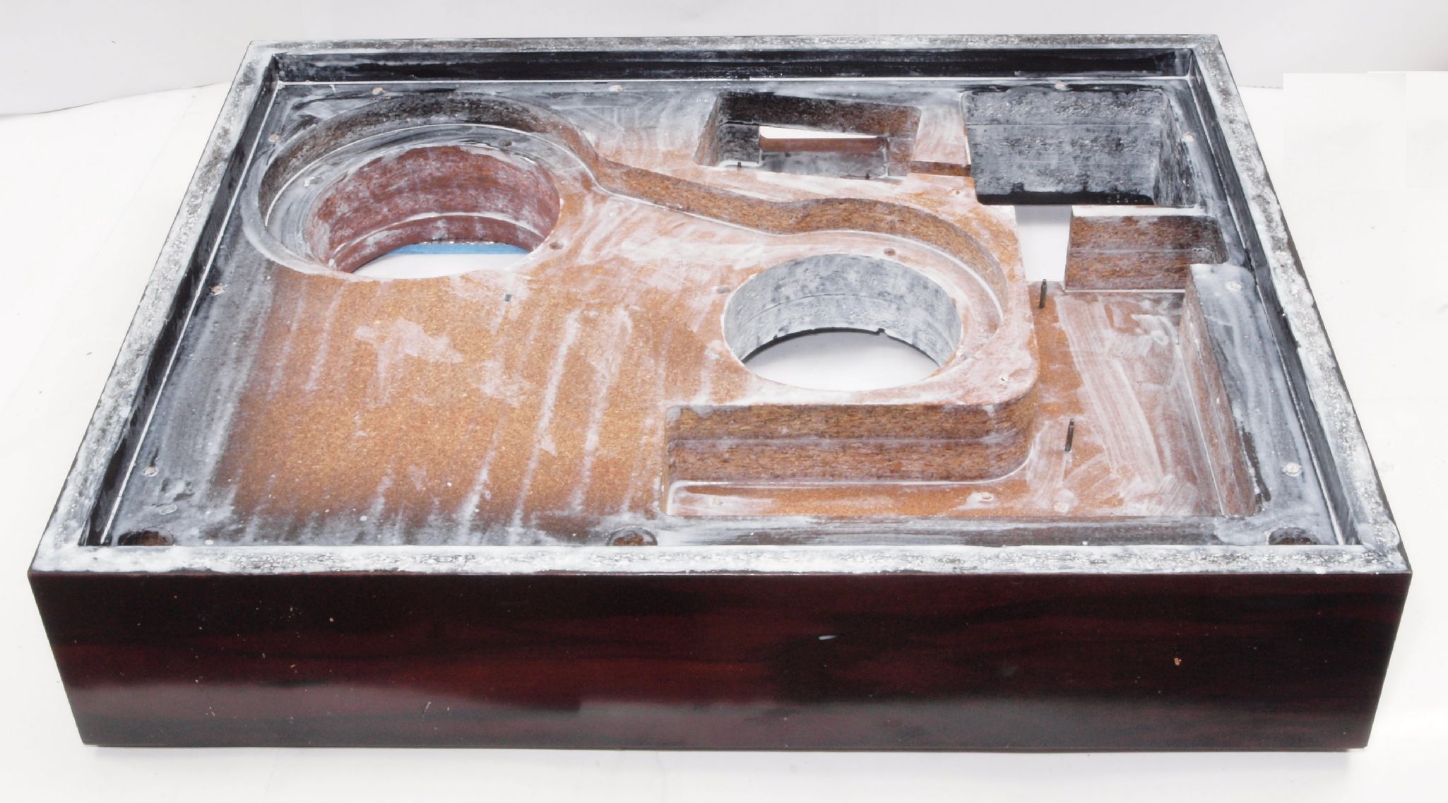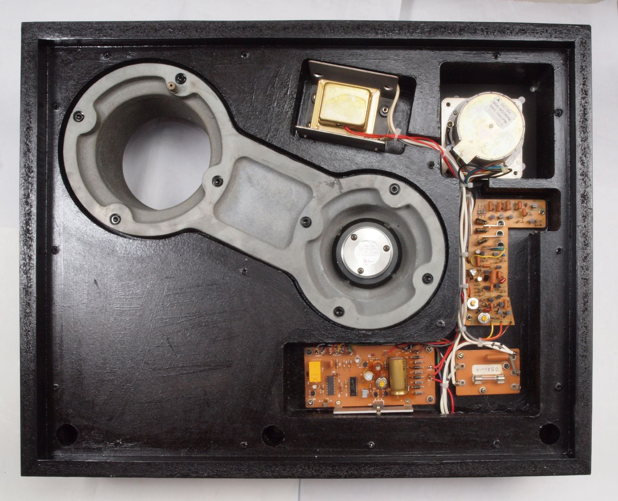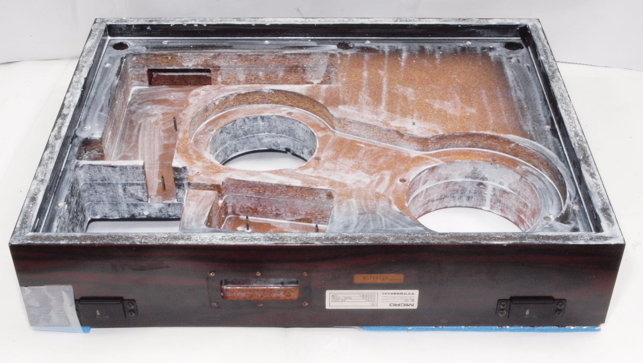 | W. 下蓋及び本体木部 修理状況。 画像をクリックすると、大きく(横幅2050ドット)表示されます。 W1. 修理前 モーター、基板、アーム架台を取り本体上から。 |