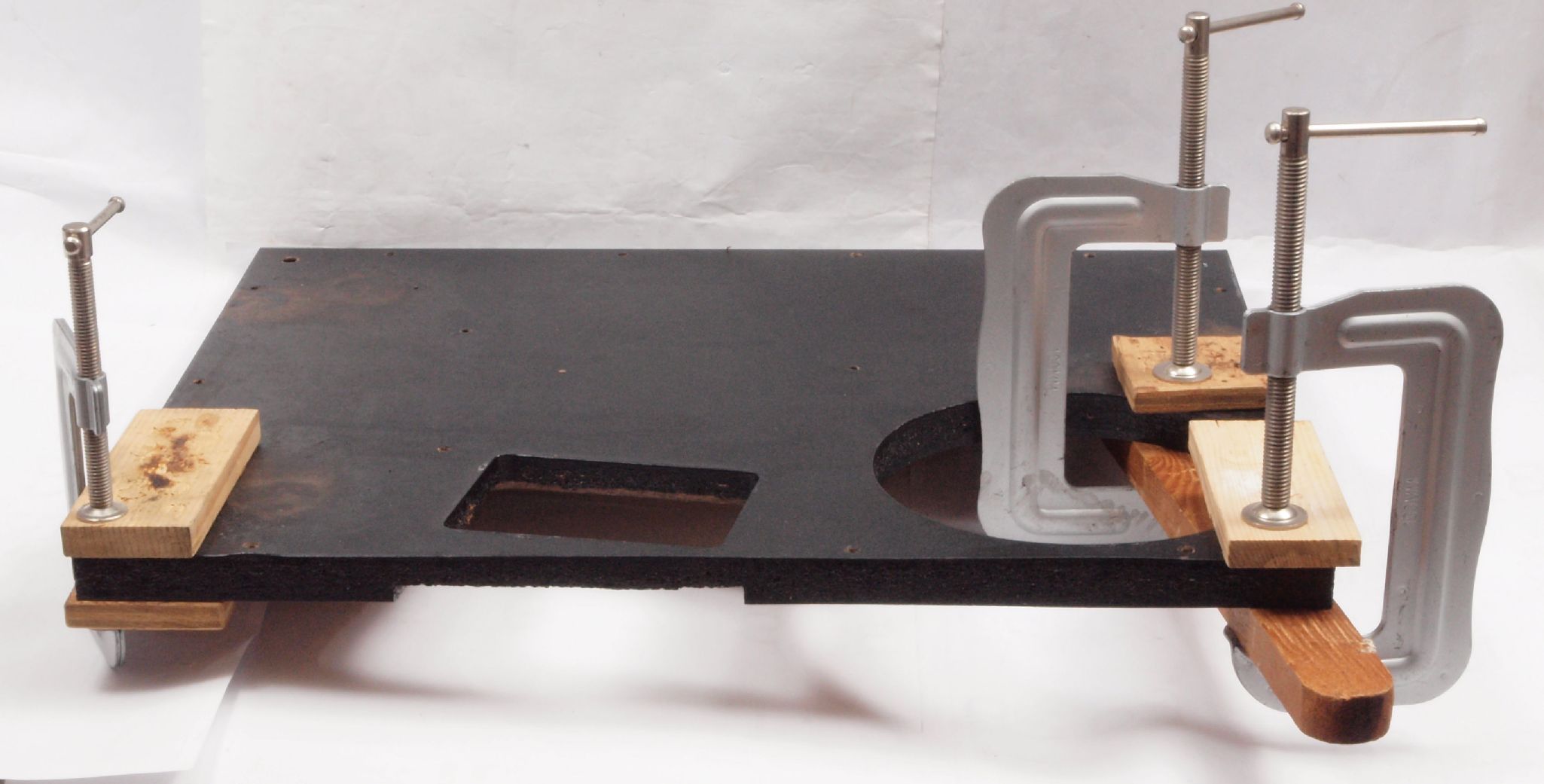 | W85. 修理中 下蓋表。接着剤を含ませ、シャコ万力で固定(圧縮)する。 | ||||||||||||||||||||||||||||||||||||||||||||||||||||