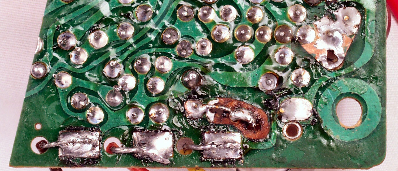 - 半田補正中に半田ブリッジをして回路を短絡した為、TR(トランジスター)焼損。