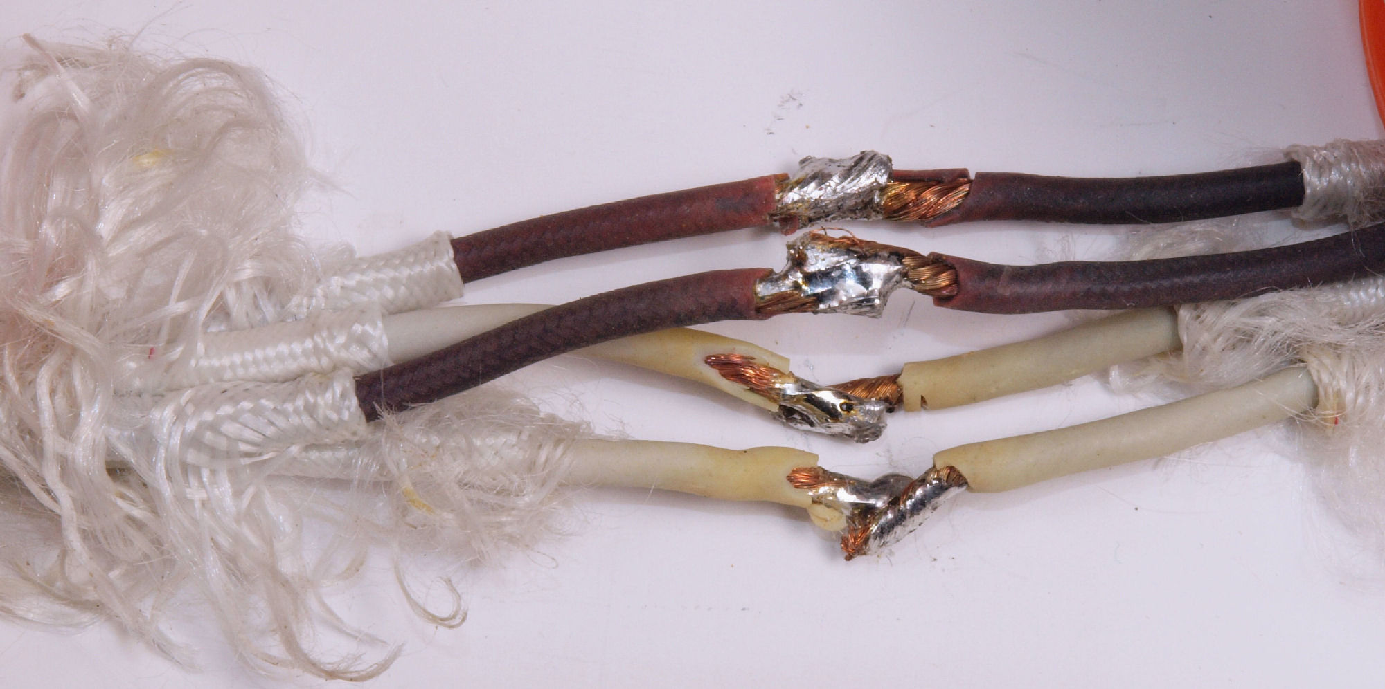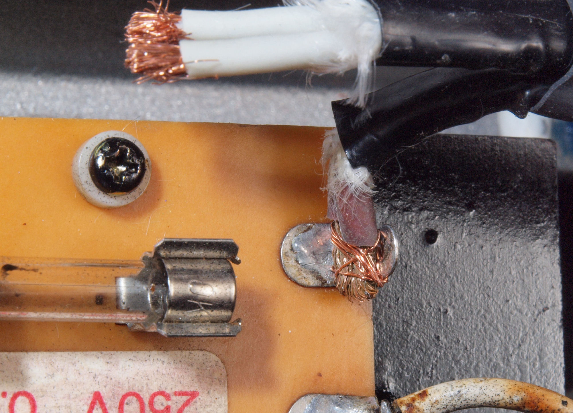 | CA3. 修理中 電源線の接続。 両線が絡げ、細い線で締める、さらに半田をしみ込ませる。 | ||||||||||||