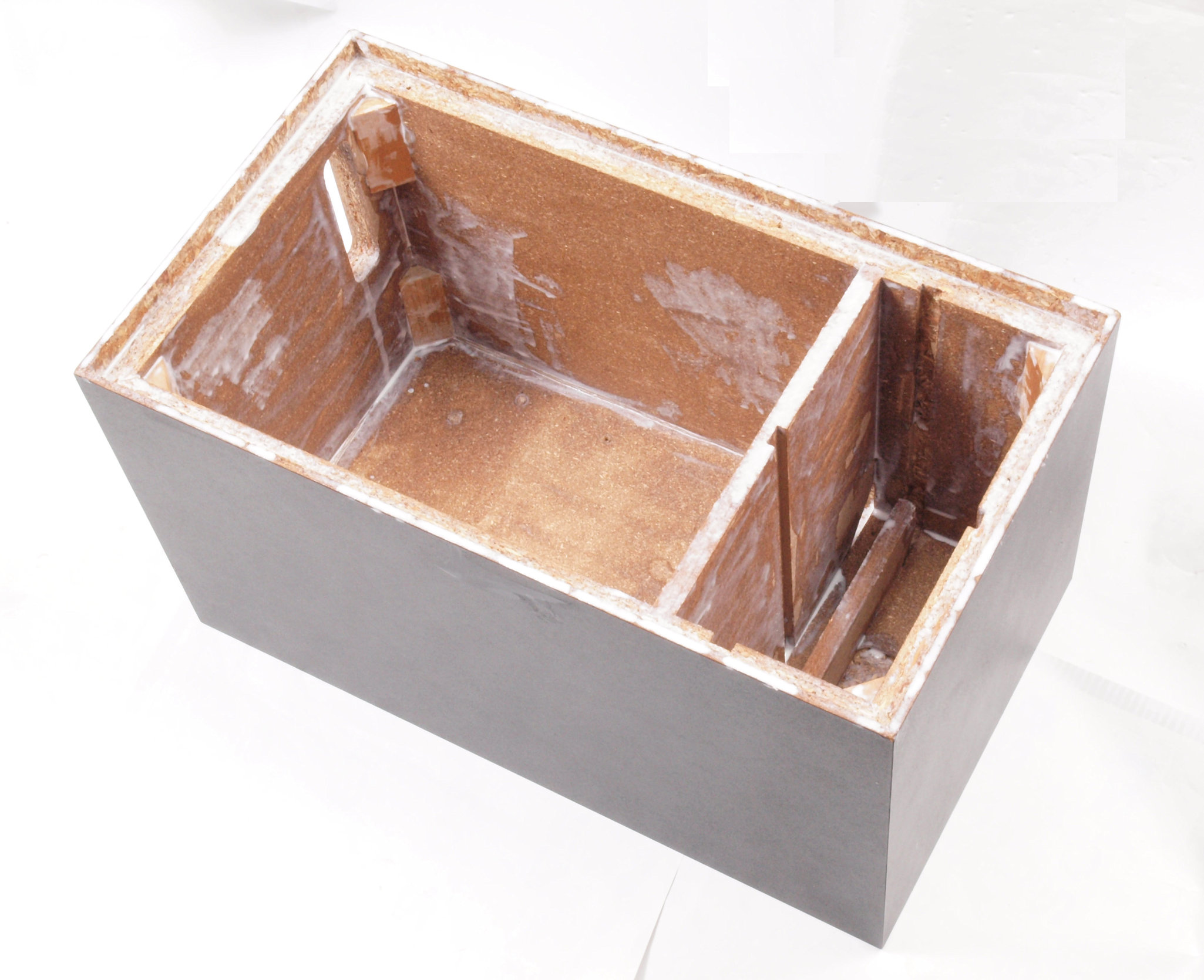 | C31. 修理前 接着材が劣化した木箱、下前右から見る。仕切り板が接着されている。 | ||||||||||||