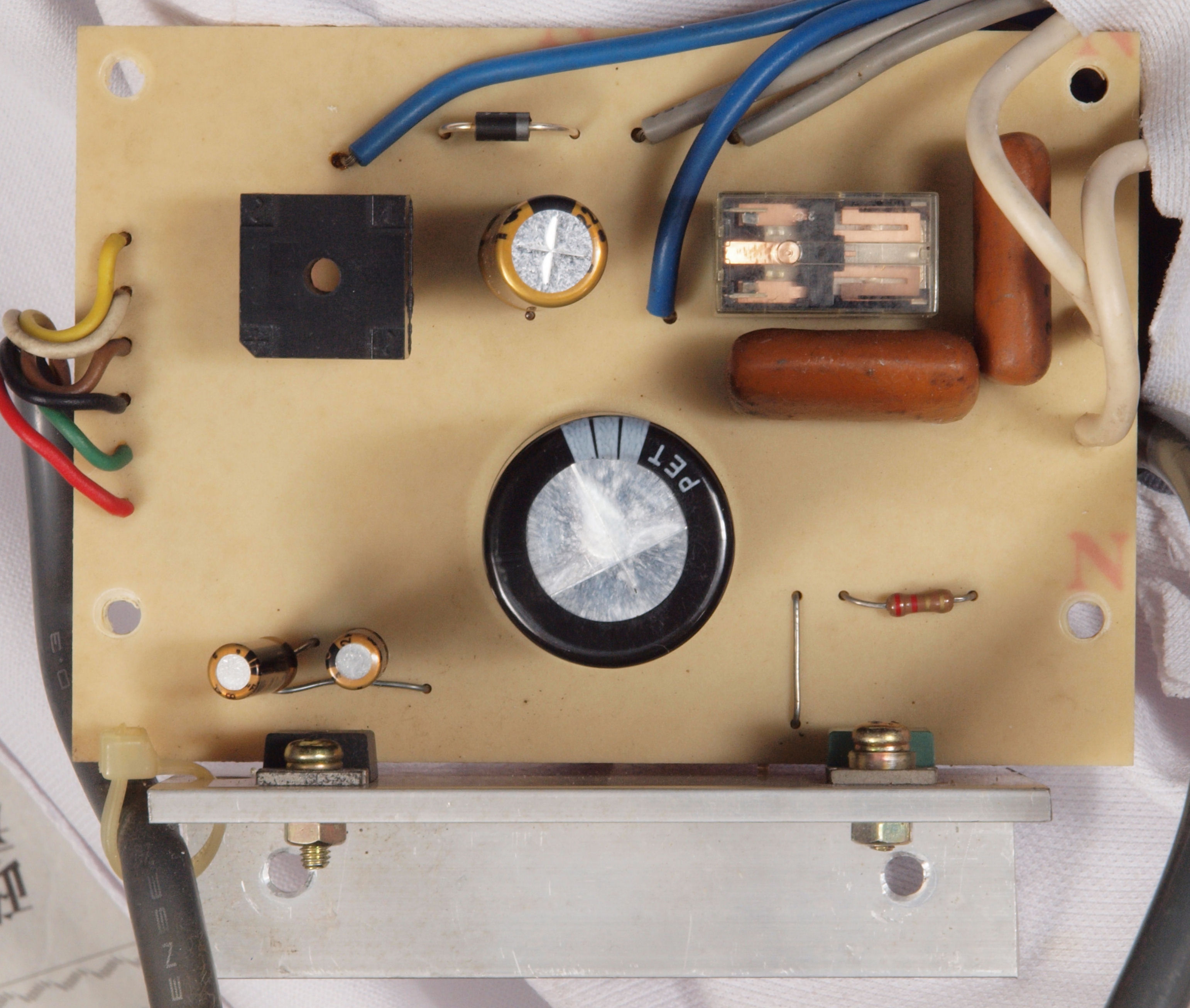 | C82. 修理後 下から見る。ケースが鉄製なので、ICの放熱を助ける為、銅板を取り付け。 |