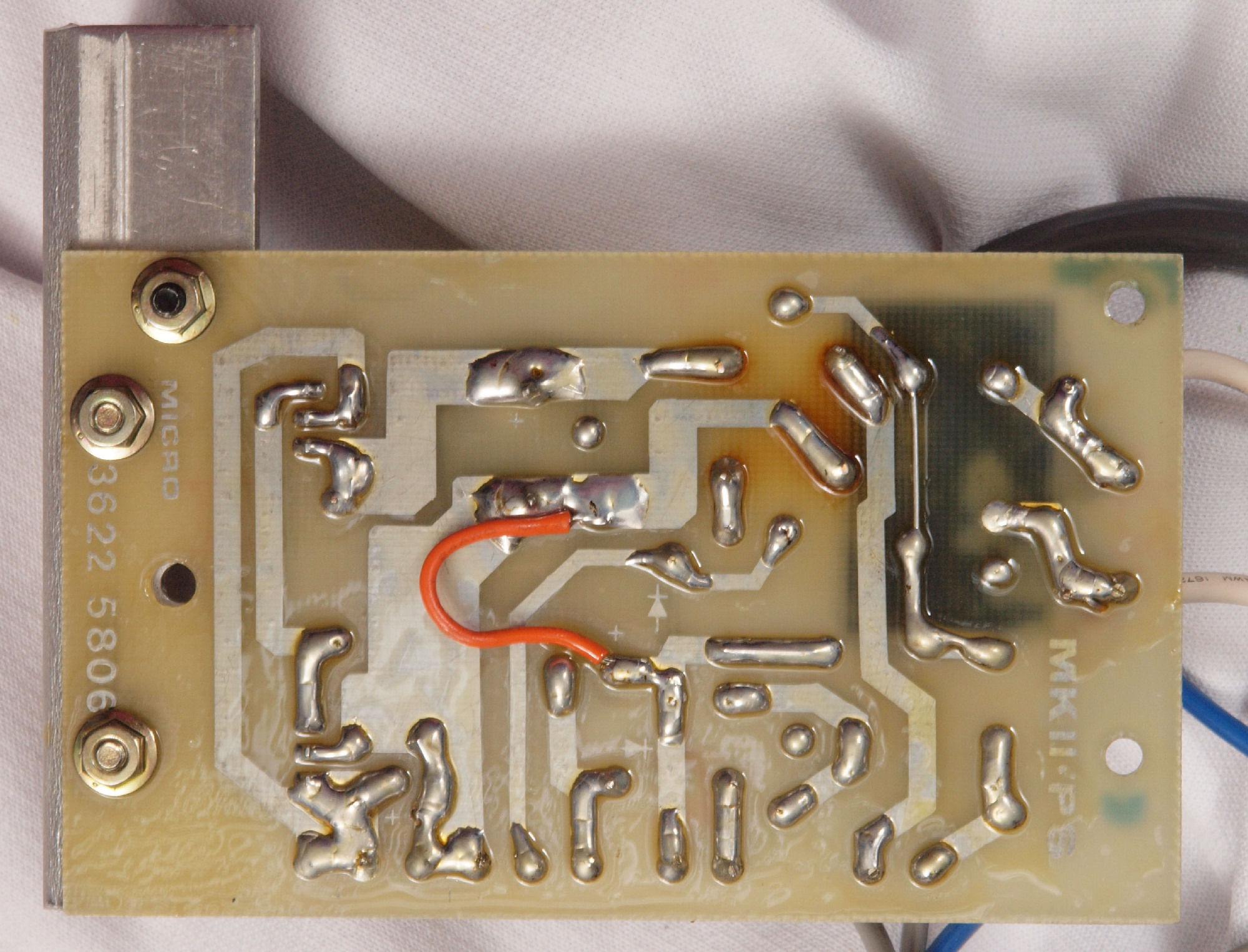 | C34. 修理(半田補正)後 モーター33/45回転 切換へ基板裏 |