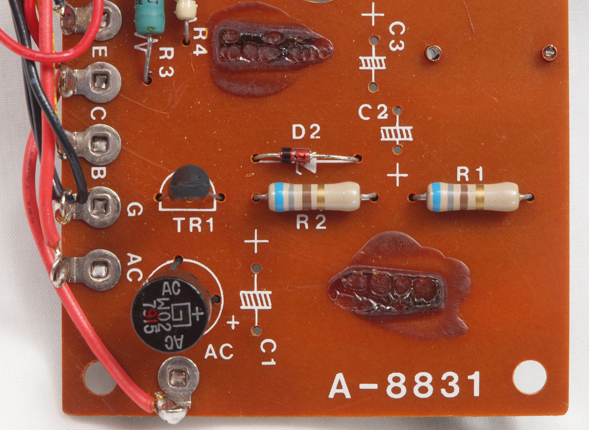 | C112. 修理前 電源・LED表示基板。 電解コンデンサー固定するトルエン溶媒の接着剤。 | ||||||||||||||||||||||||||||||||||||||||