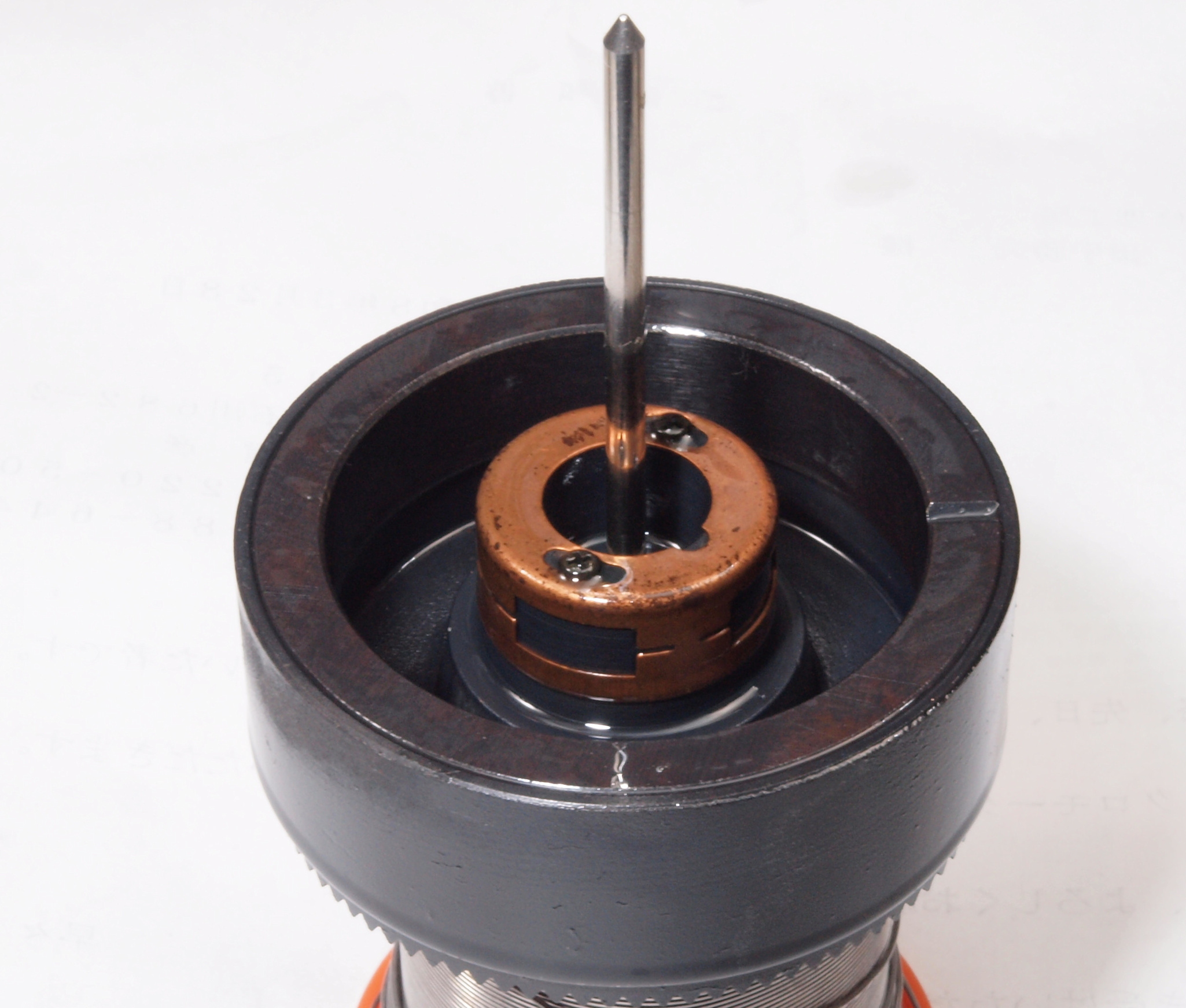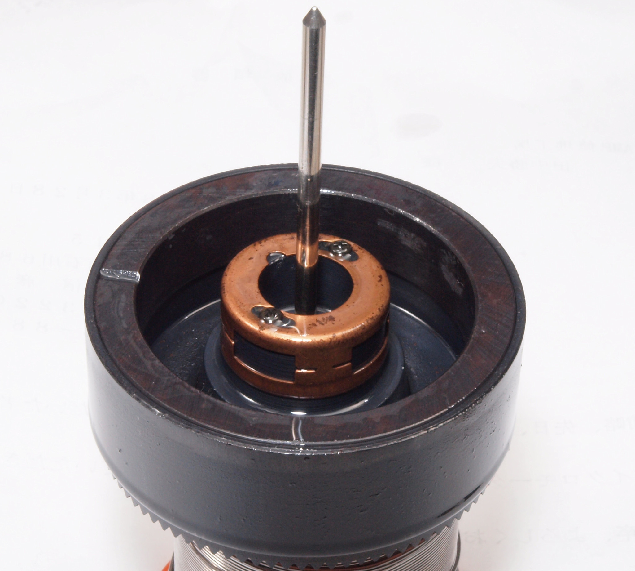 | C65. 修理中、モータ回転子上側軸受を下から見る、反対側。 熱の為、油分が黒化。 | ||||||||||||||||||||||||||||||||||||||||