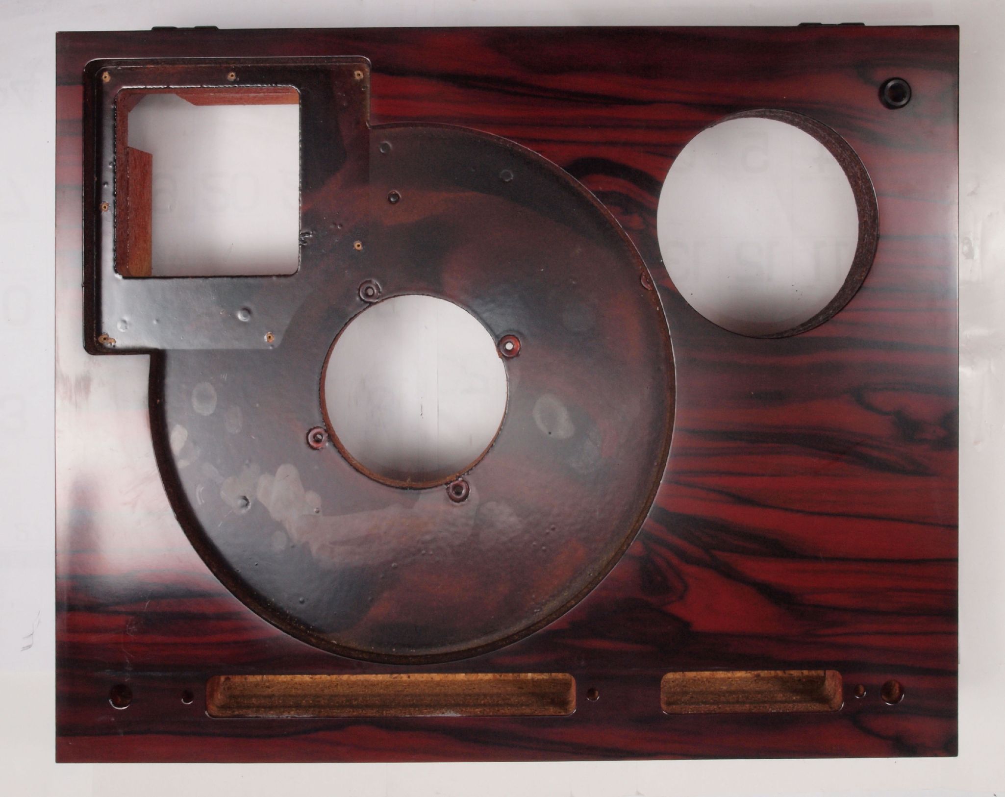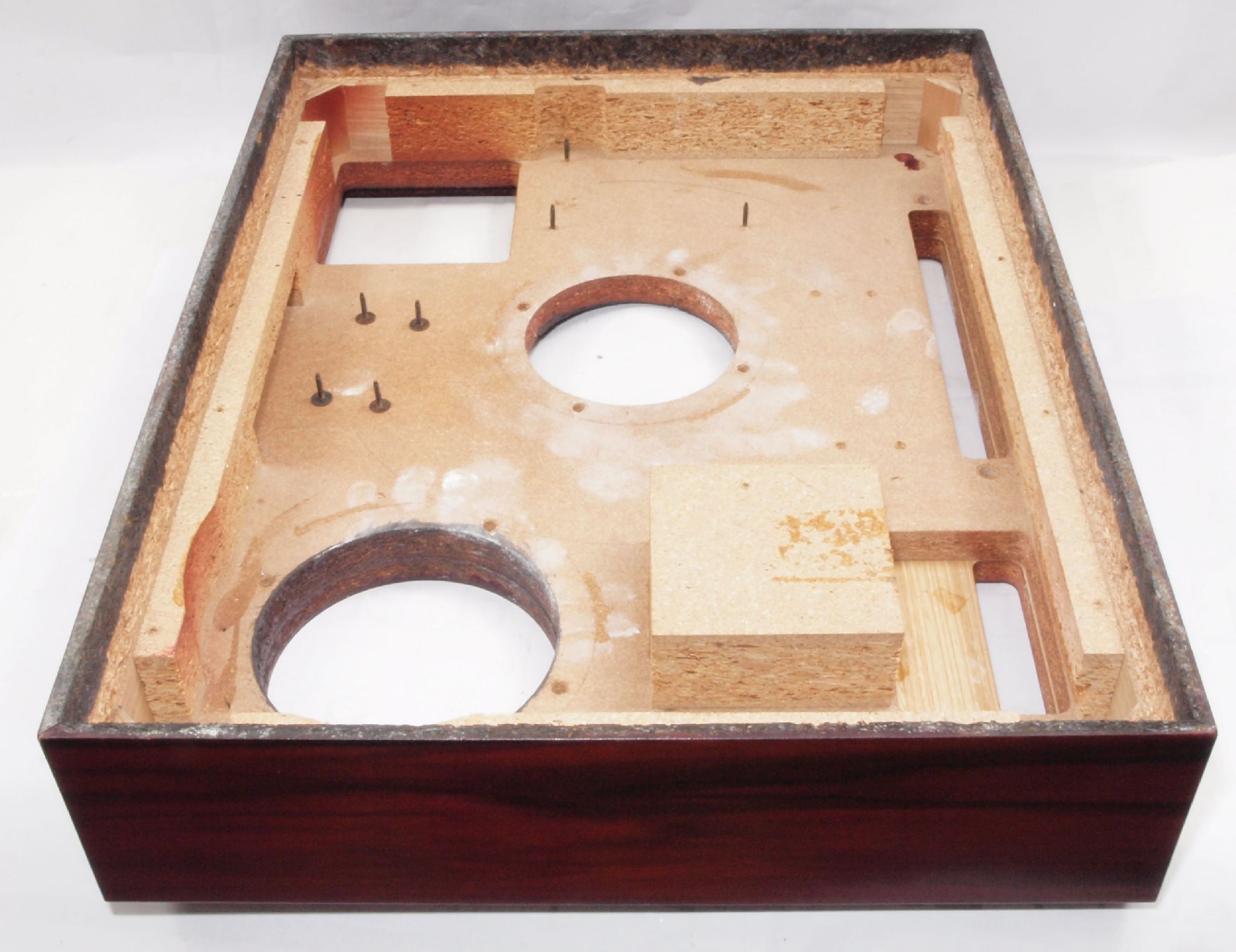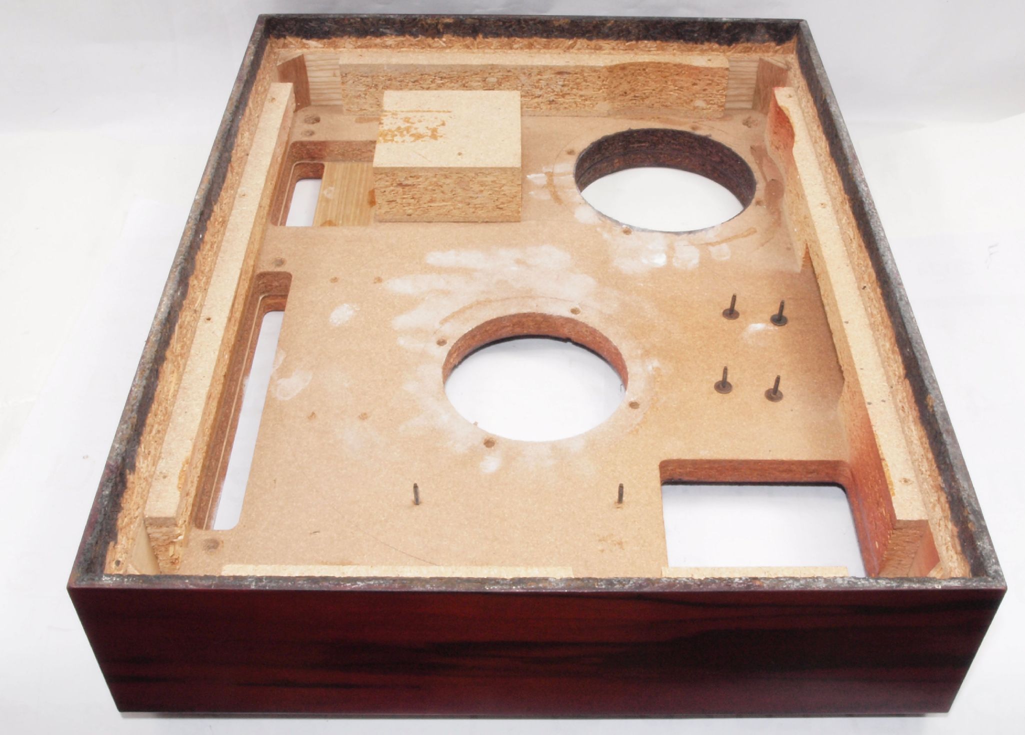 | W. 下蓋及び本体木部 修理状況。 画像をクリックすると、大きく(横幅2050ドット)表示されます。 W1. 修理前 タンテーブル軸ユニット、アーム取付一体シャーシを外した本体。 |