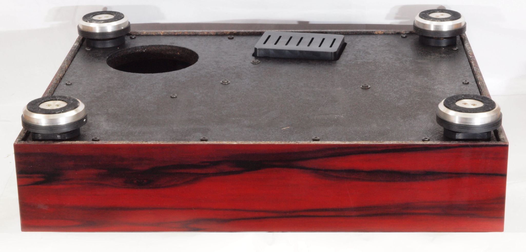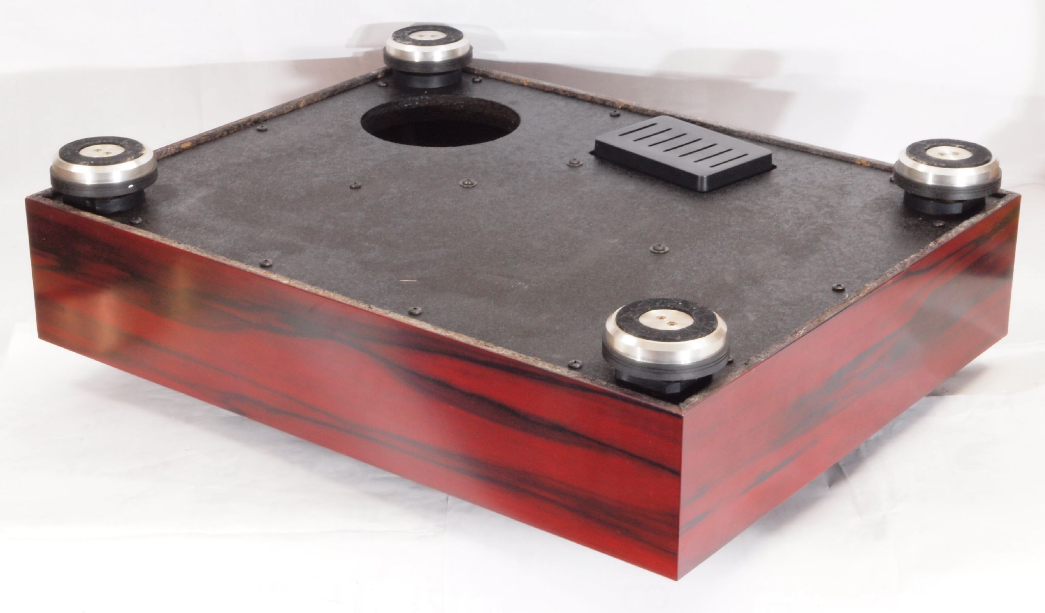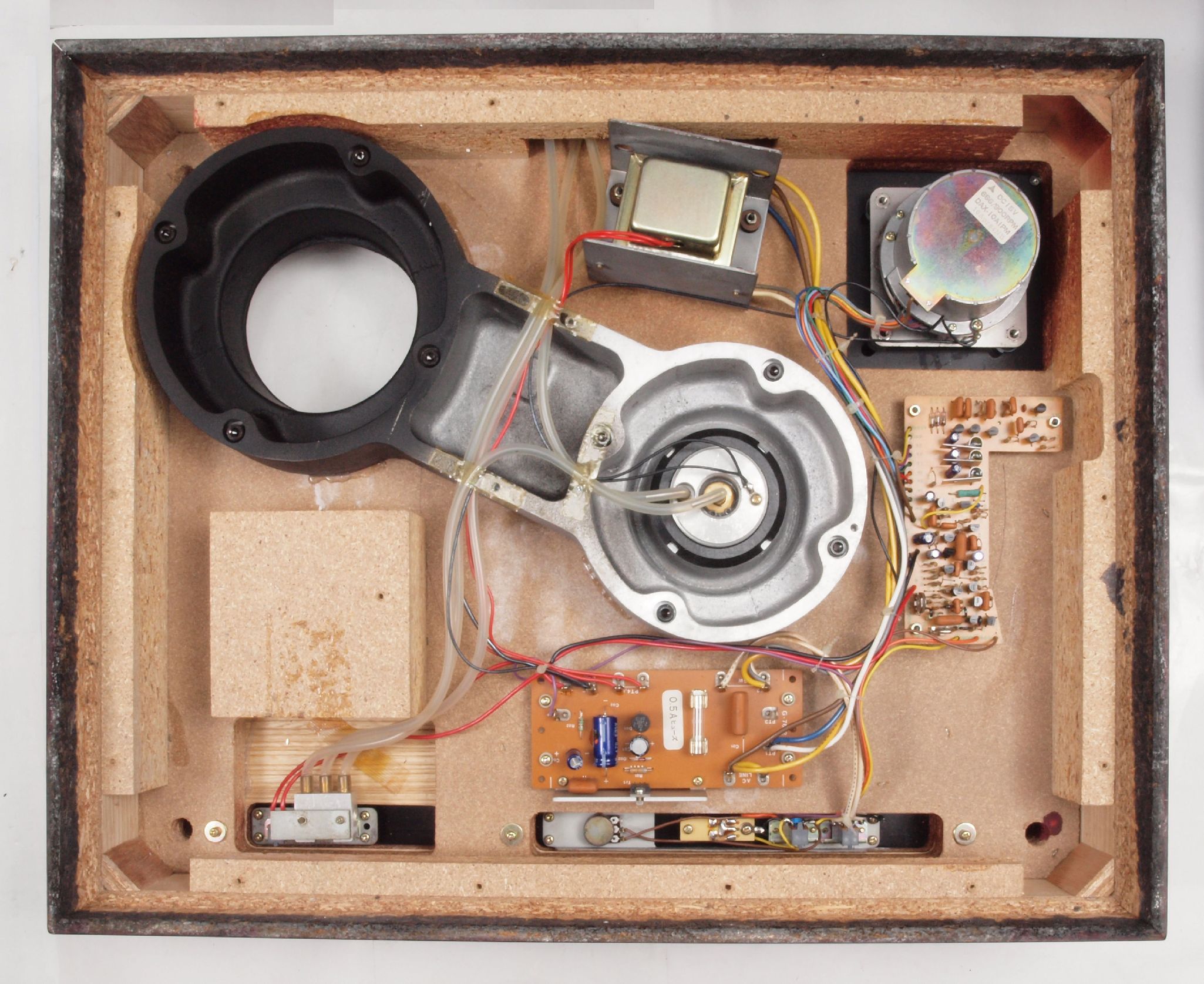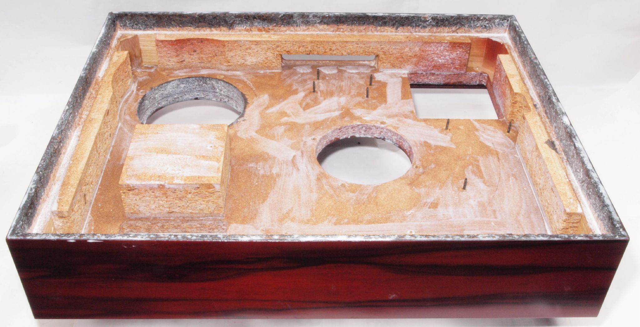 | W. 下蓋及び本体木部 修理状況。 画像をクリックすると、大きく(横幅2050ドット)表示されます。 W1. 修理前 タンテーブル軸ユニット、アーム取付一体シャーシを外した本体。 |