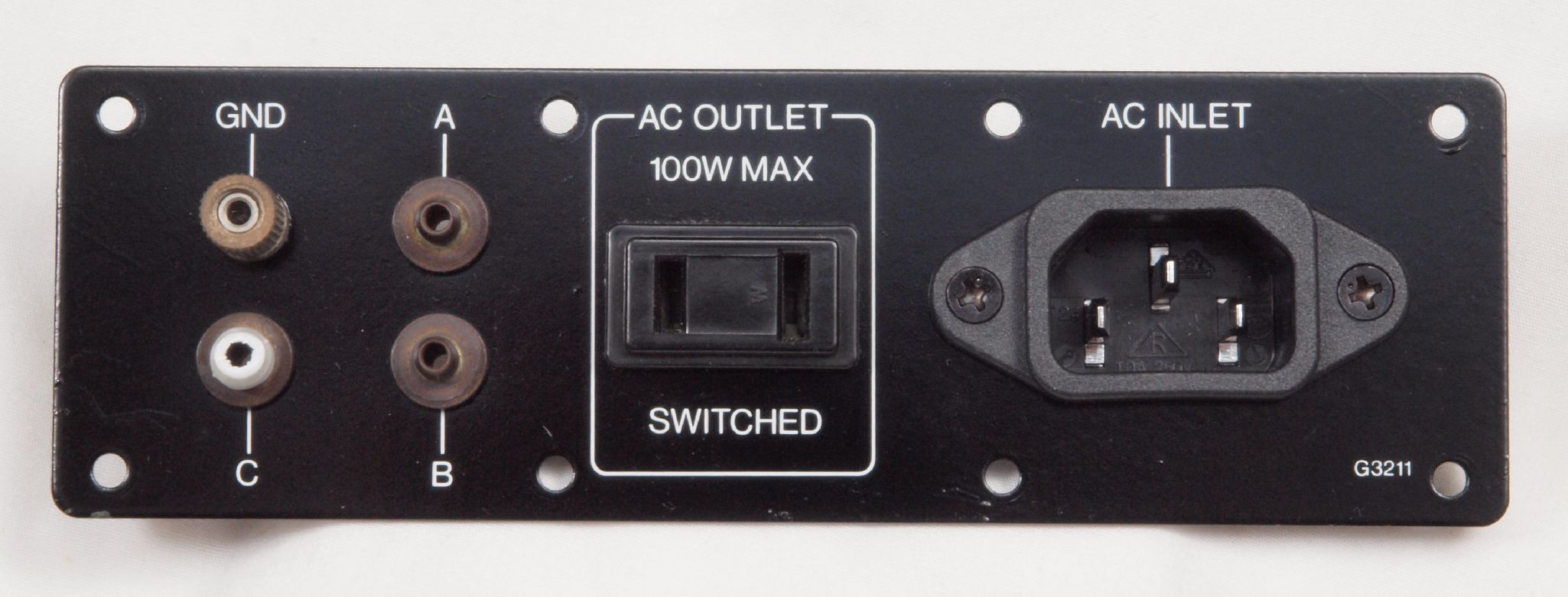 | A72. 点検中 電源コンセントパネル。 3Pインレットに交換可能。FURUTECH FI-10(R) ロジウムメッキ。 |
