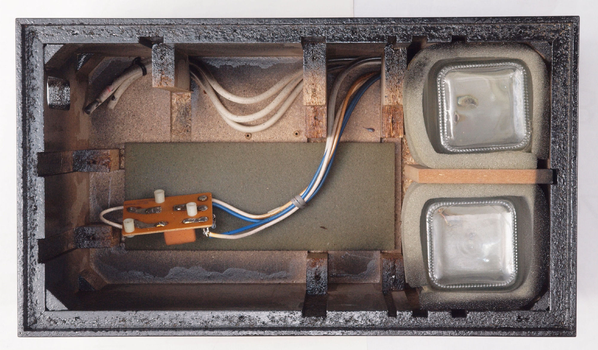| C62. 修理中 木ネジで割れた、「ポンプ取り付け圧縮板」、「フューズ取付圧縮板」、ボンドを染みこませる。 |