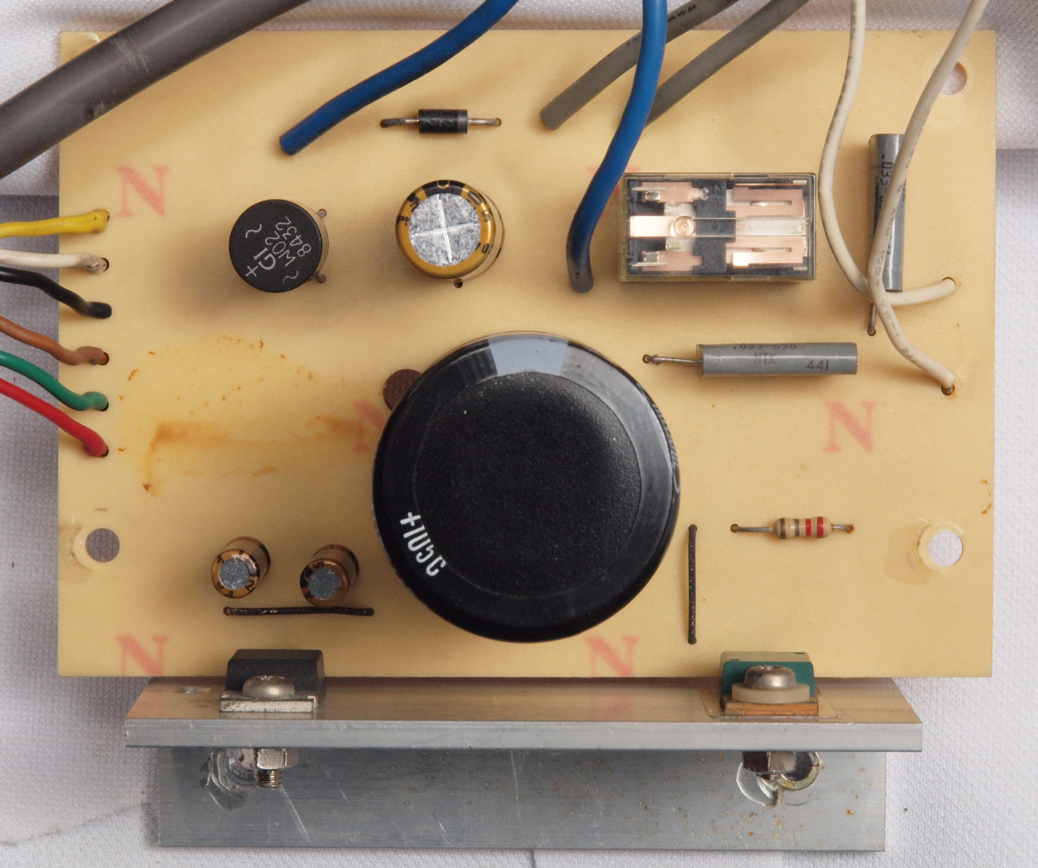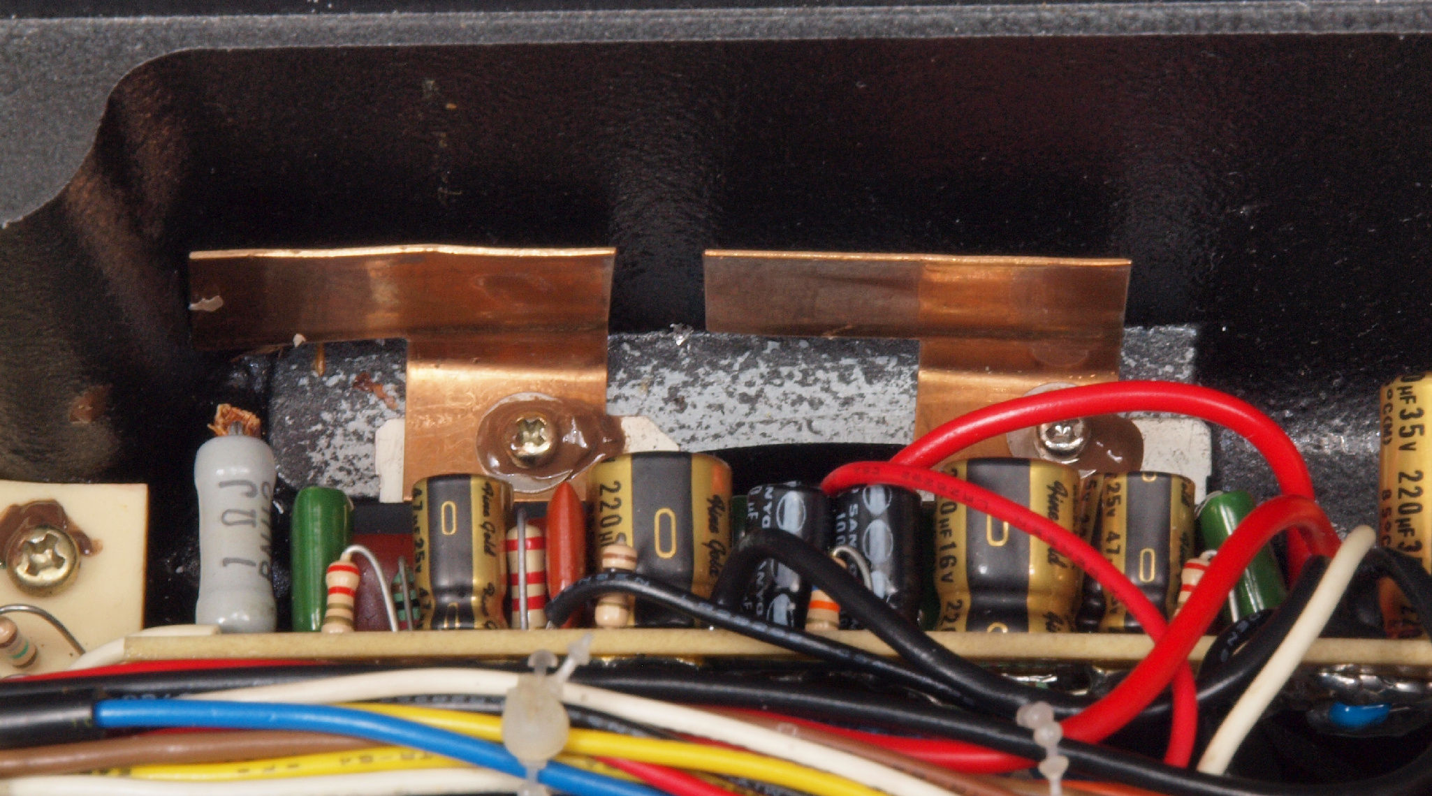 | D41. 修理後 下から見る。ケースが鉄製なので、ICの放熱を助ける為、銅板を取り付け。 |