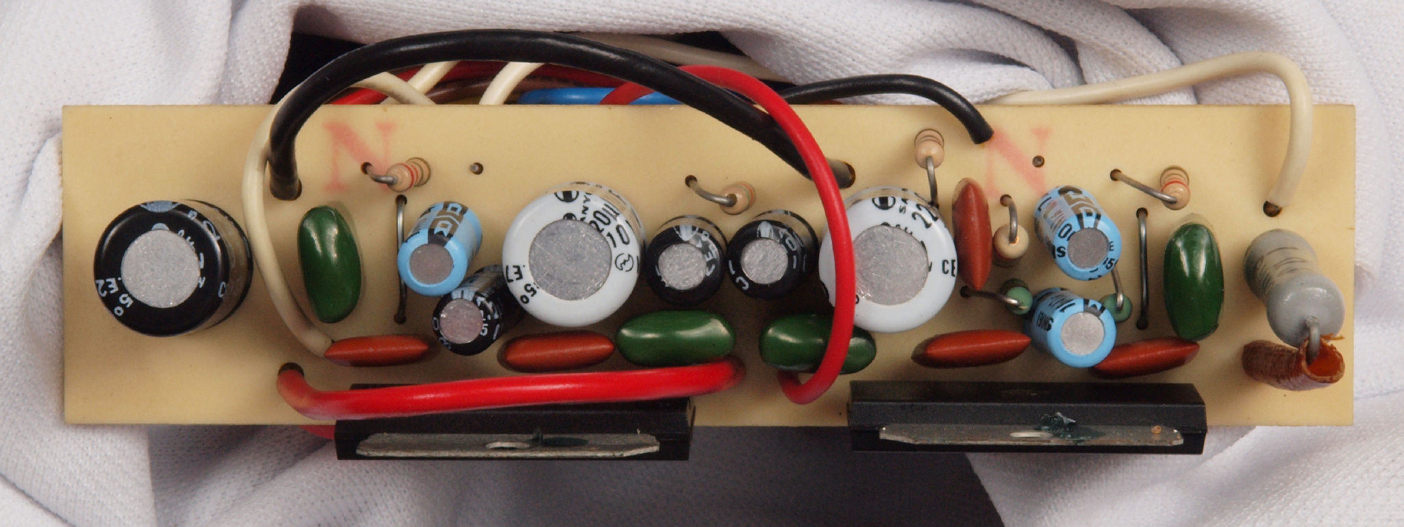 | D75. 完成電源部整流基板裏。余分なフラックスを落として、コート液を塗る。 |