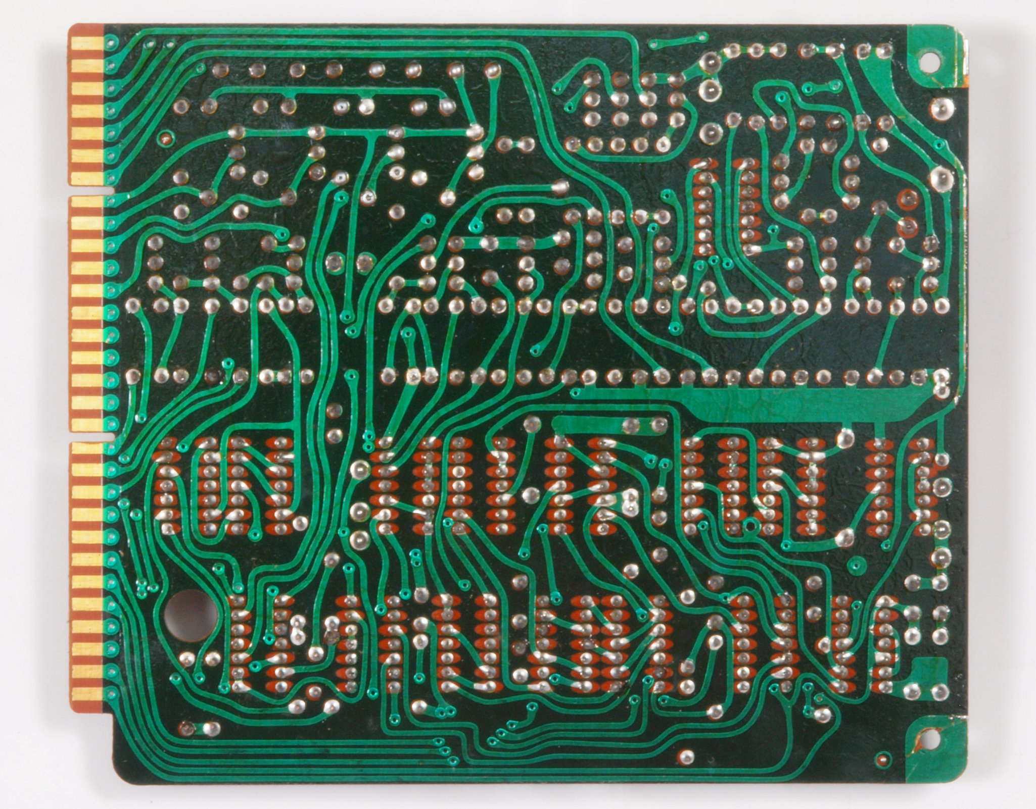 C732. 完成駆動基板裏。余分なフラックスを落として、コート液を塗る。スルホール半田1。
