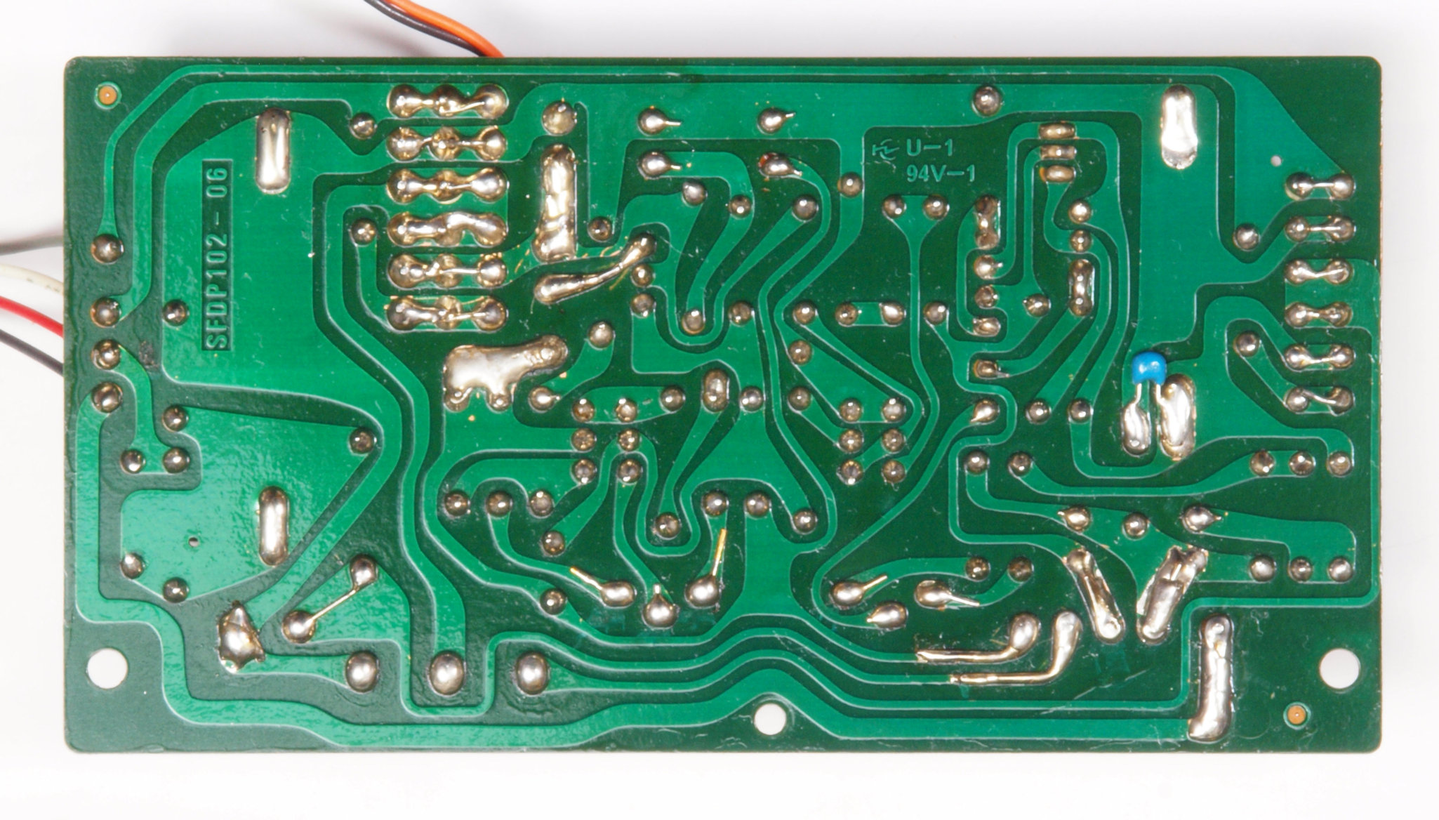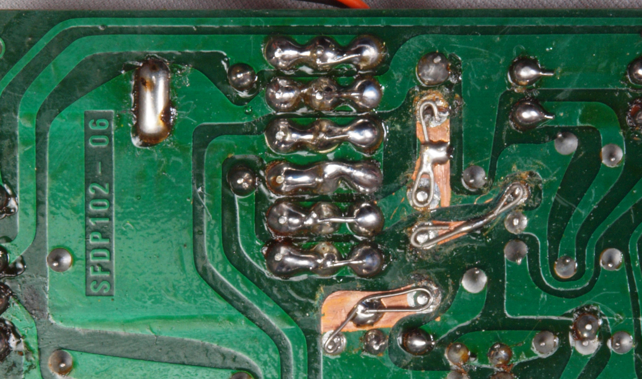 C95. 修理(半田補正)後 メイン基板裏。全ハンダをやり直す。電解コンデンサー1個、フイルムコンデンサー2個交換。