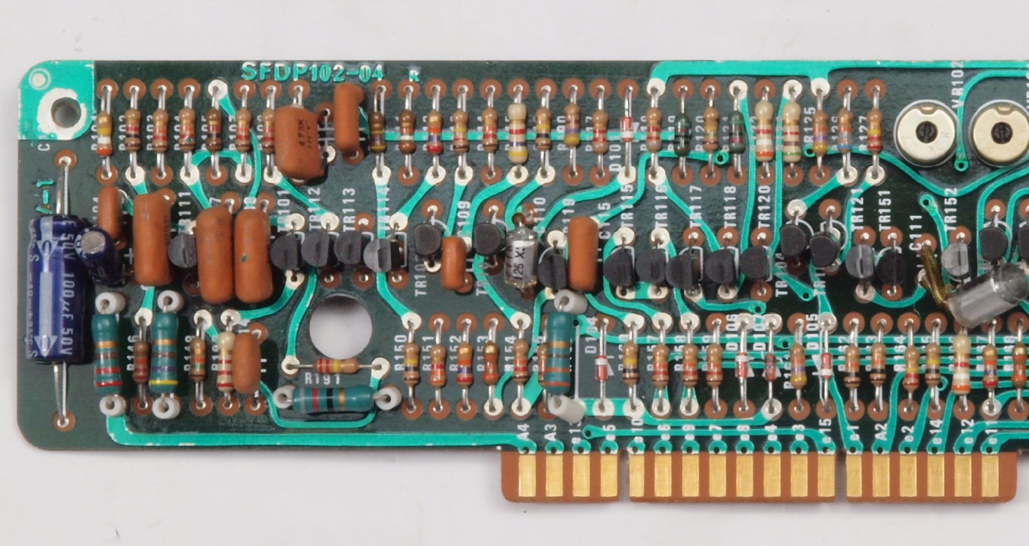 | C44. 完成基準発生・速度切替え分周基板。余分なフラックスを落として、コート液を塗る。前回の修理で割れた、角の固定穴を補強する。 | ||||||||||||||||||||||||||||||||||||