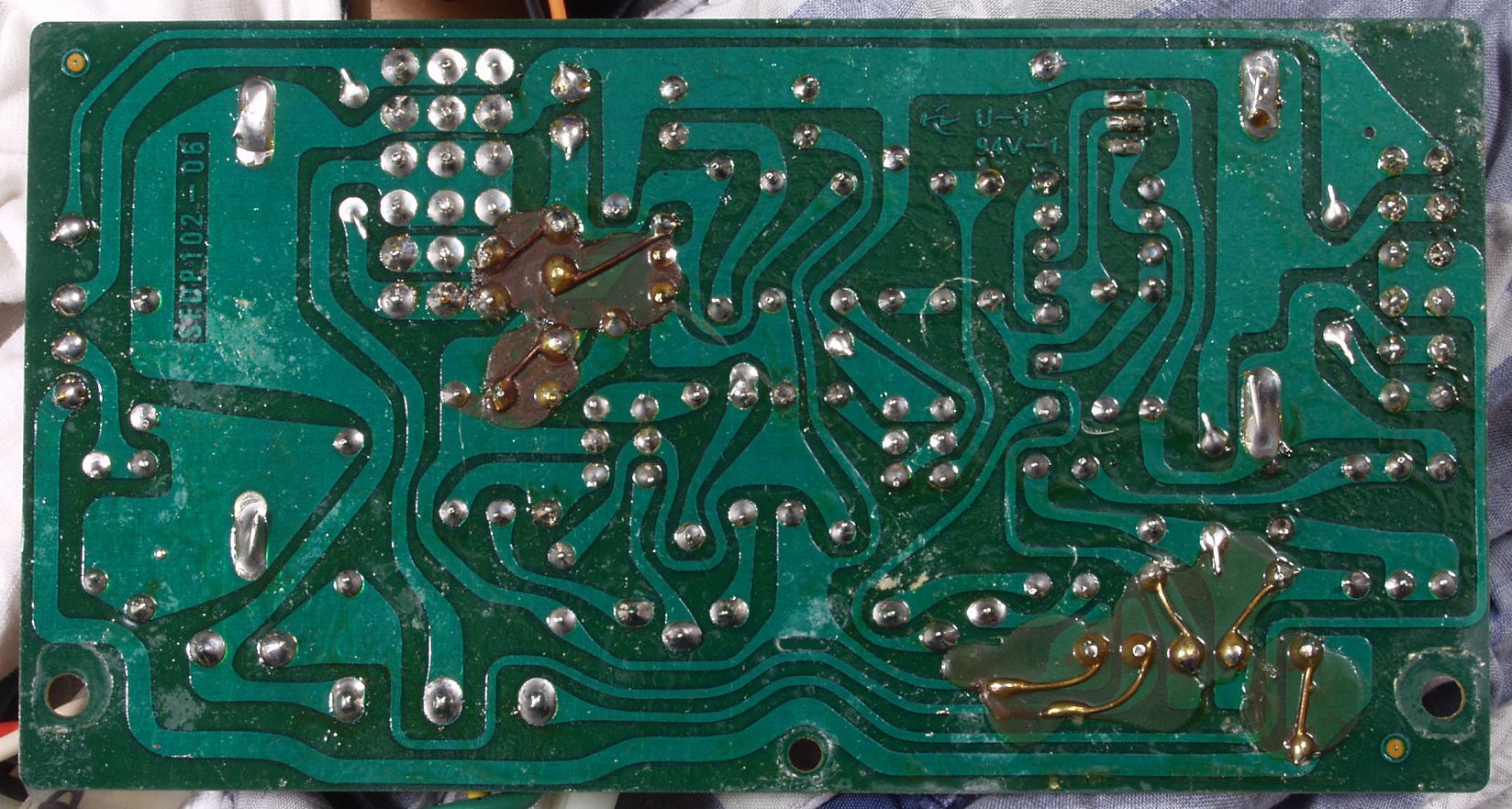 | C−2C. 修理(半田補正)後 電源ヒューズ基板裏。全ハンダをやり直す。 | ||||||||||||||||||||||||||||||