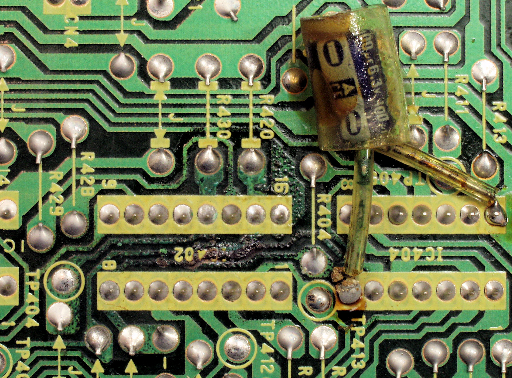 | C232. 修理前 定電圧回路基板裏、電解コンデンサーの液漏れで腐食した銅箔。 | ||||||||||||||||||||||||||||||||||||||