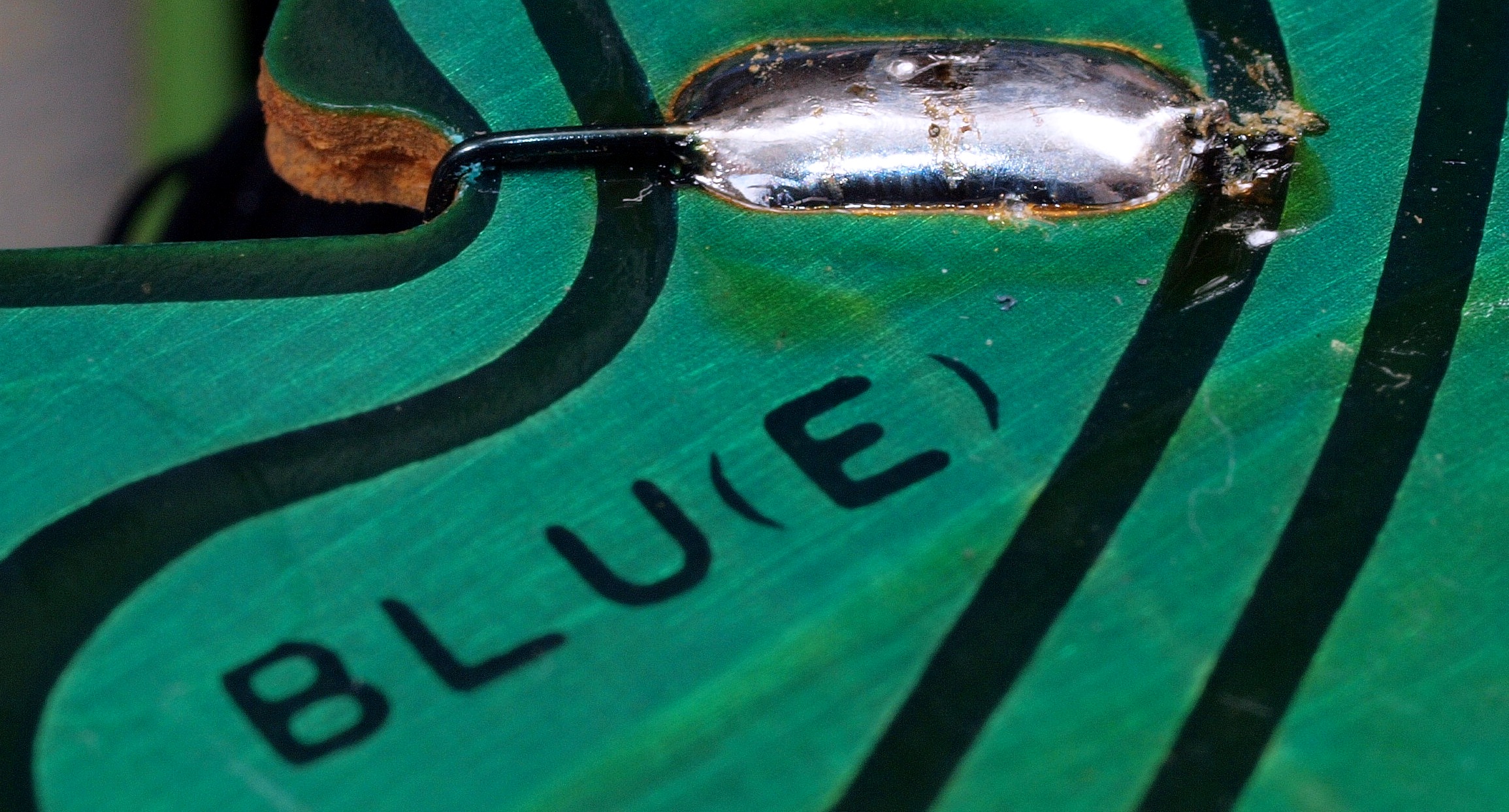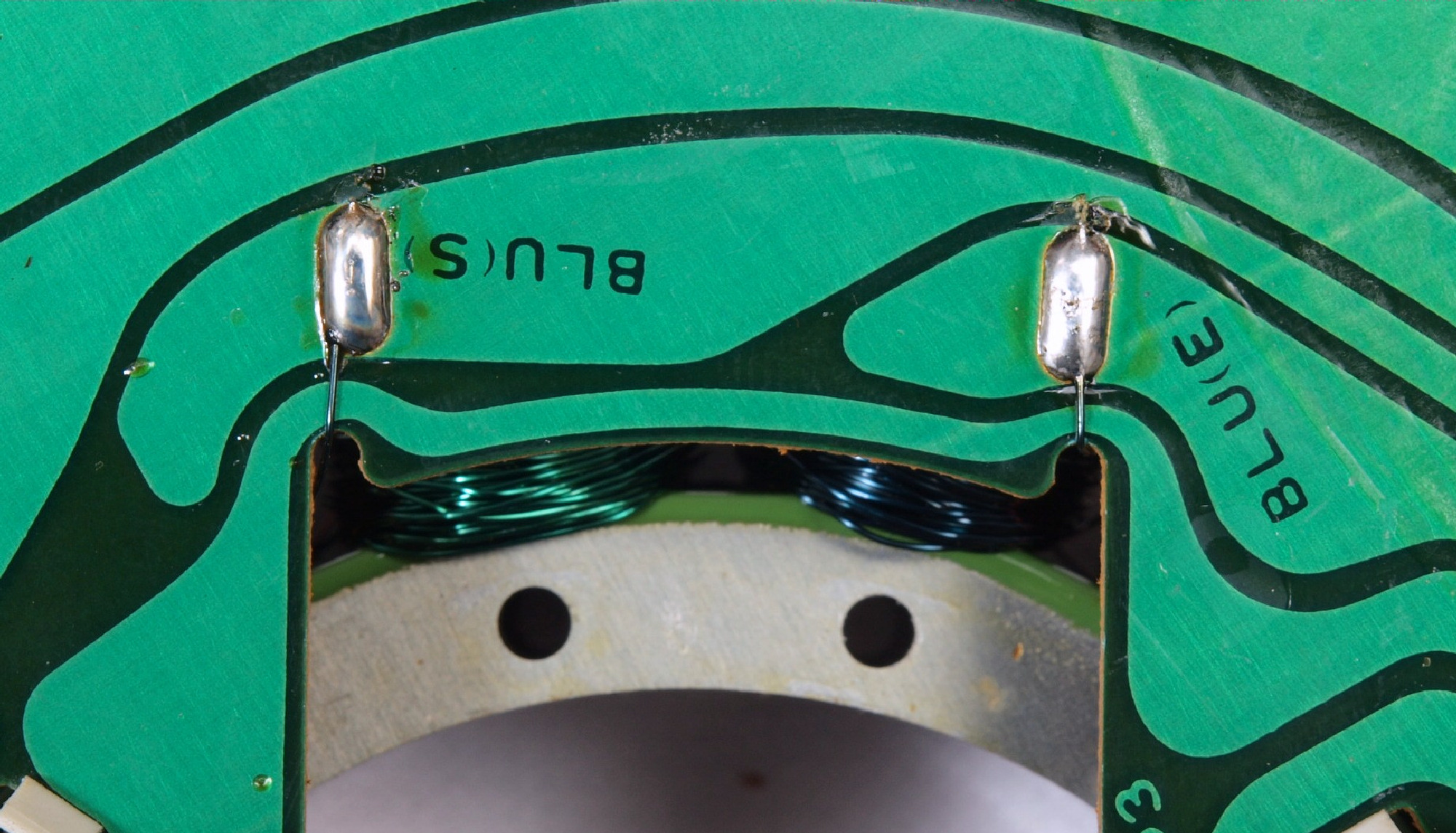 | M413. 修理中、 アマチュア(回転子)基盤裏巻線半田、引き出し線が絶縁していない!(BLUE巻線)拡大 | ||||||||||||||||||||||||||||||||||||||||