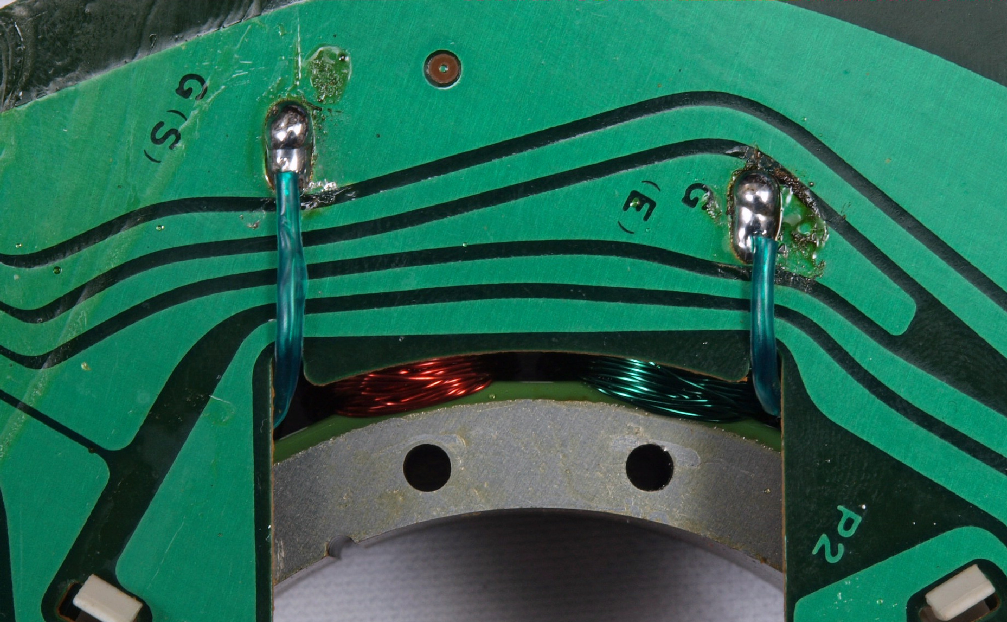 | M513. 修理中、 アマチュア(回転子)基盤裏巻線半田、引き出し線が絶縁していない!(GREEN巻線)拡大 | ||||||||||||||||||||||||||||||||||||||||