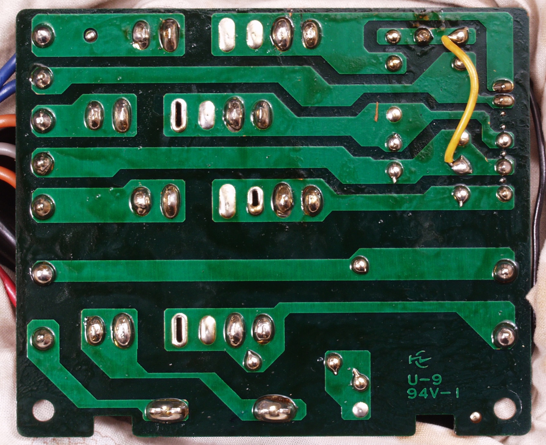 | C−4E. 完成制御回路基板裏。余分なフラックスを落として、コート液を塗る。 | ||||||||||||||||||||||||||||||||||||||