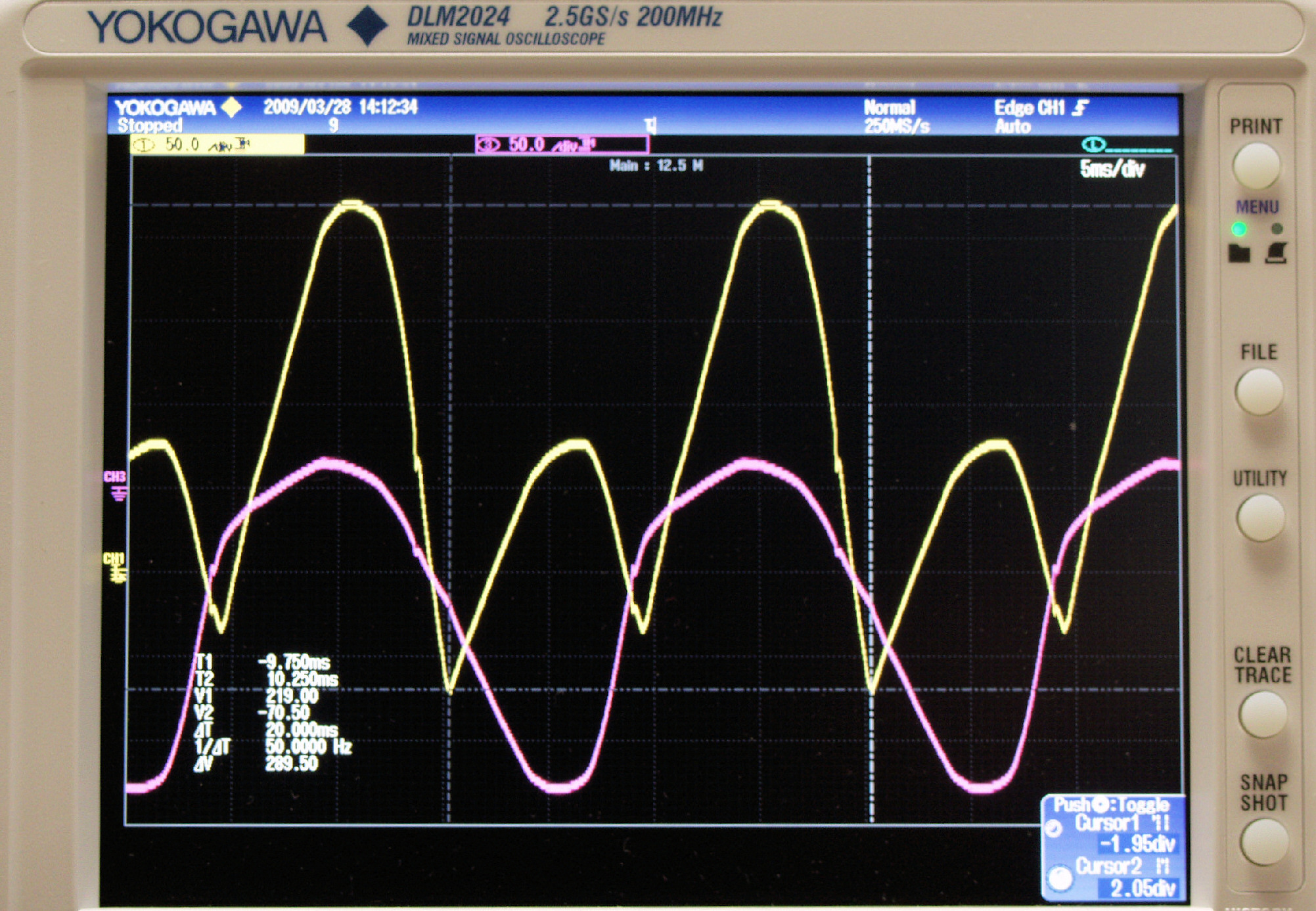 H23. 「JJ−ECC99」測定の入出力波形、赤色=グリッド電圧、黄色=プレート電圧。