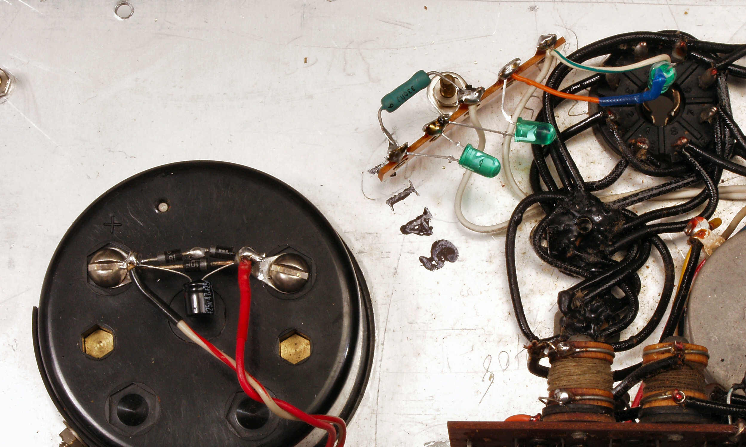 C41. 修理中 メータに保護ダイオード取り付け。 電源表示にオクタルソケットの中心にLED取り付け。