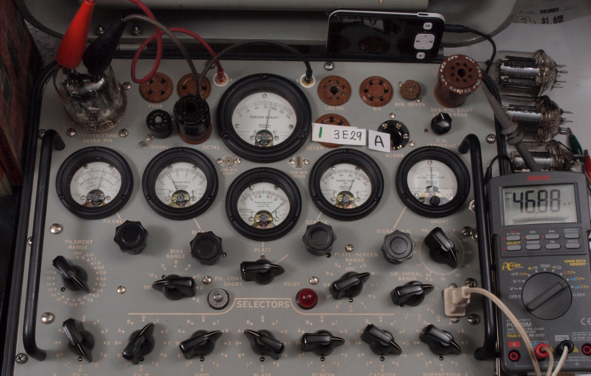 | C11. 1本目 3E29 ユニット1測定。 Gm=8200μmho、Ip=46.88mA。 測定条件、 「Ep=250V、Esg=175V、Eg1=−12V」RangeSW=C、FullScale=15000μmho。 |