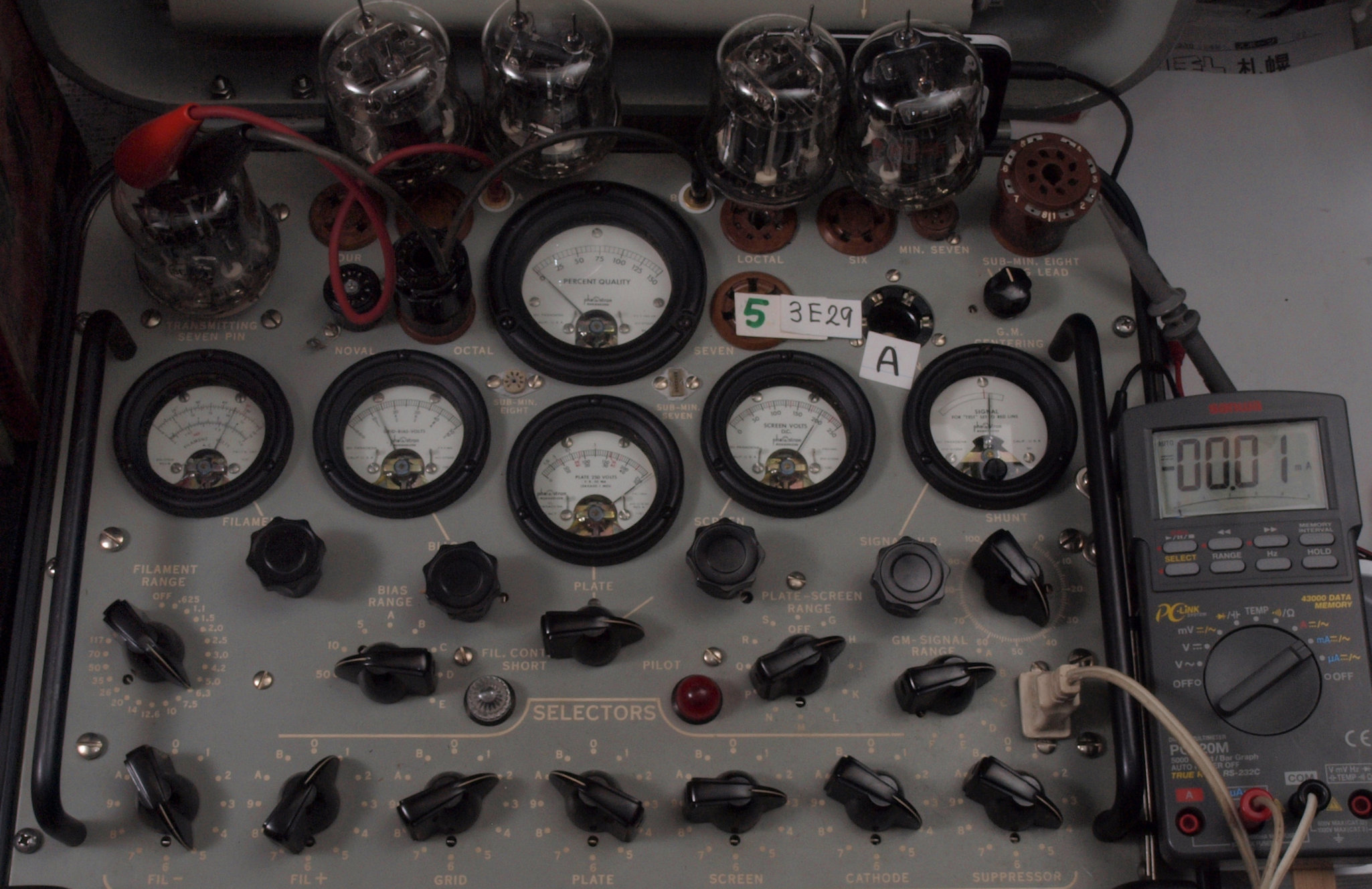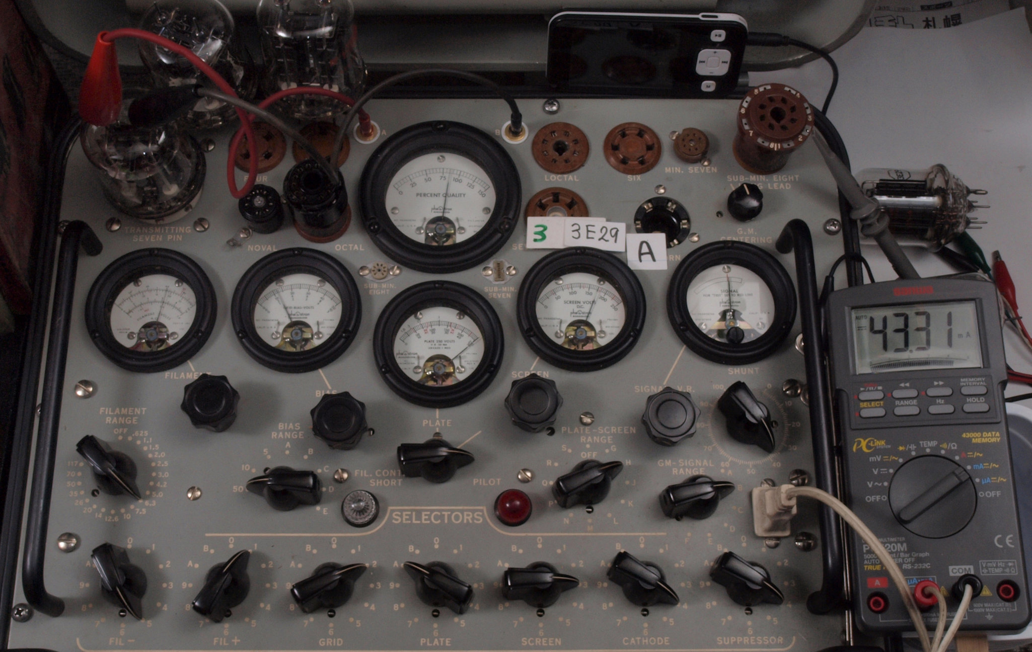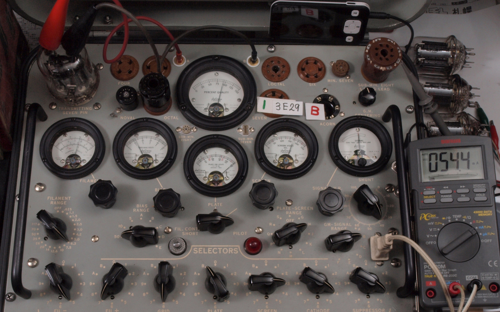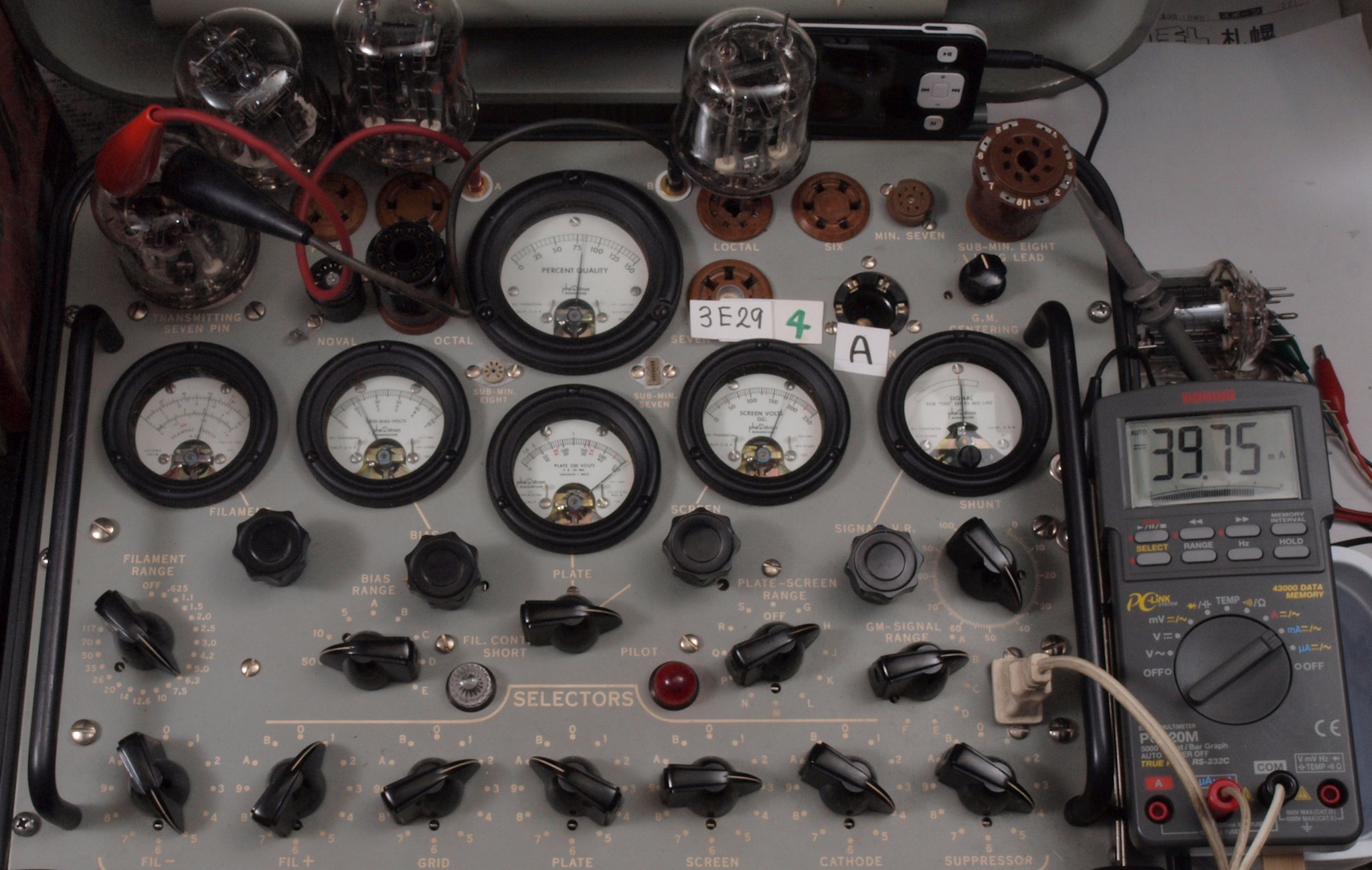 | A31. 3本目 3E29 ユニット1測定。 Gm=7700μmho、Ip=62.1mA。 測定条件、 「Ep=250V、Esg=175V、Eg1=−12V」RangeSW=C、FullScale=15000μmho。 |
