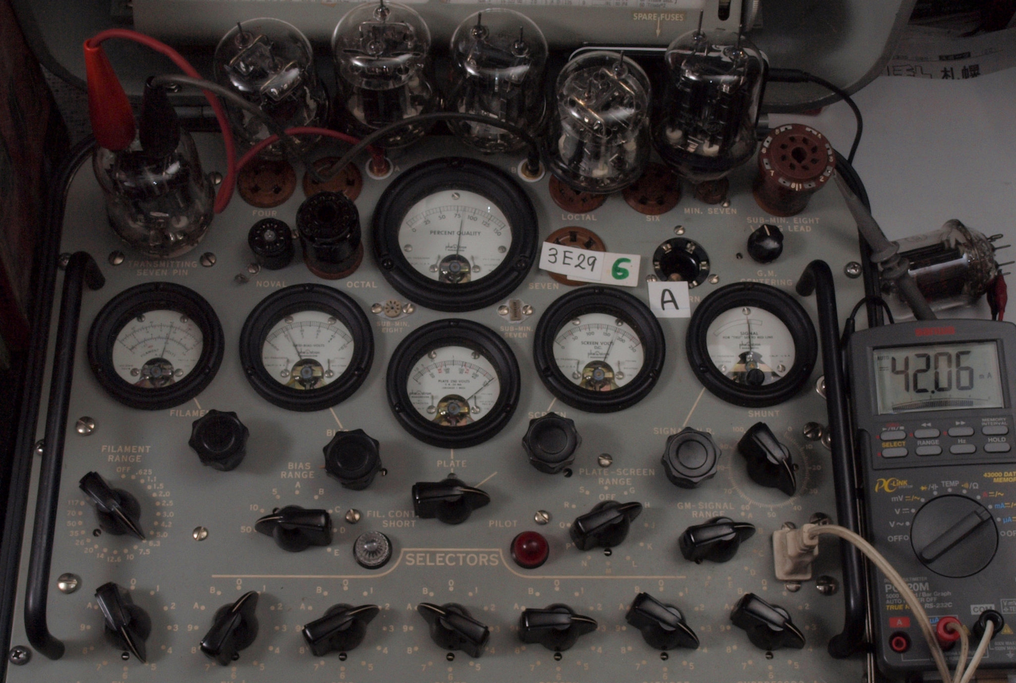 | C61. 6本目 3E29 ユニット1測定。 Gm=8300μmho、Ip=42.06mA。 測定条件、 「Ep=250V、Esg=175V、Eg1=−12V」RangeSW=C、FullScale=15000μmho。 |