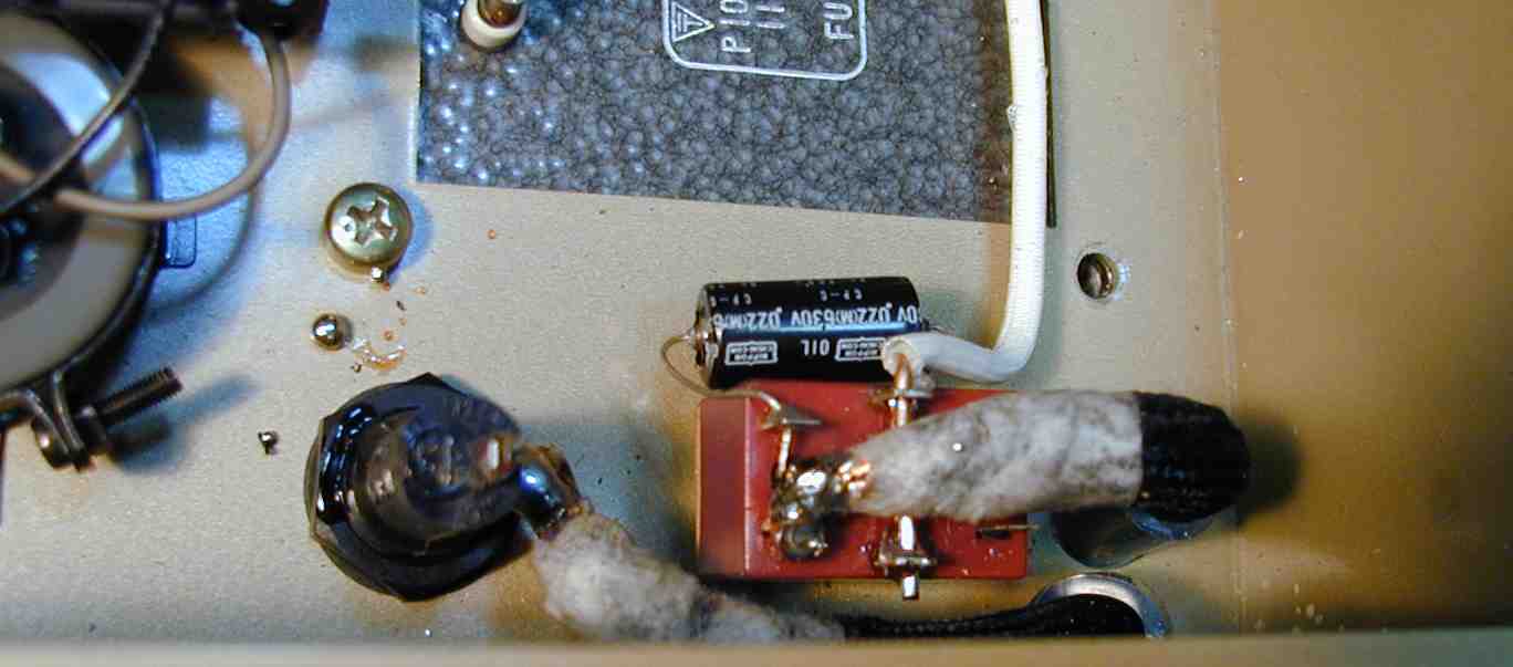 | 33. 電源SWの改良例 (Musical Fidelity A−1000 ) 修理前、この小さなSWで電源線の両方を「ON=入り」「OFF=切り」していた 詳細はこちら参照 |