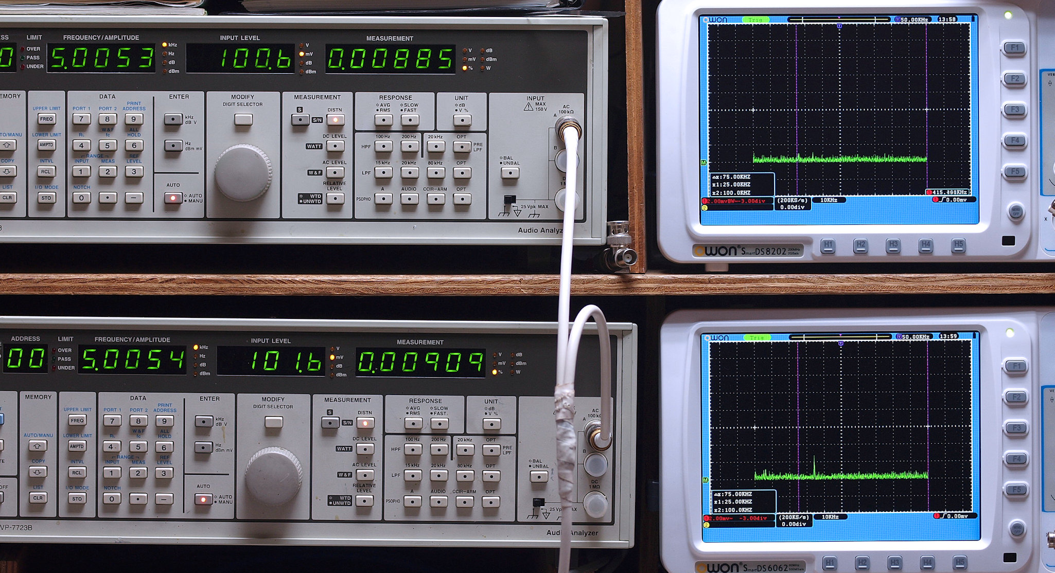 50Hz〜100kHzの信号を上段中及び下段中「Audio Analyzer Panasonic VP−7723B」により測定。