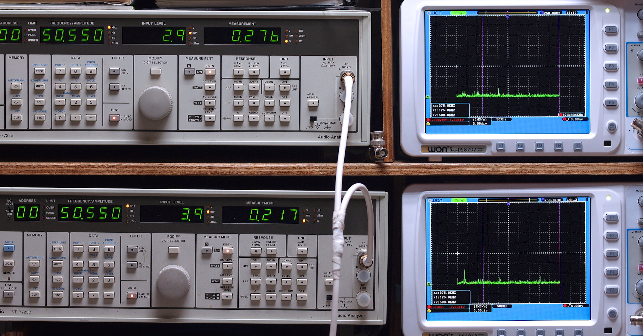 上段右端及び下段右端 VP−7723Bの基本波除去出力を「owon SDS8202(200MHZ)」で「FFT分析」表示。