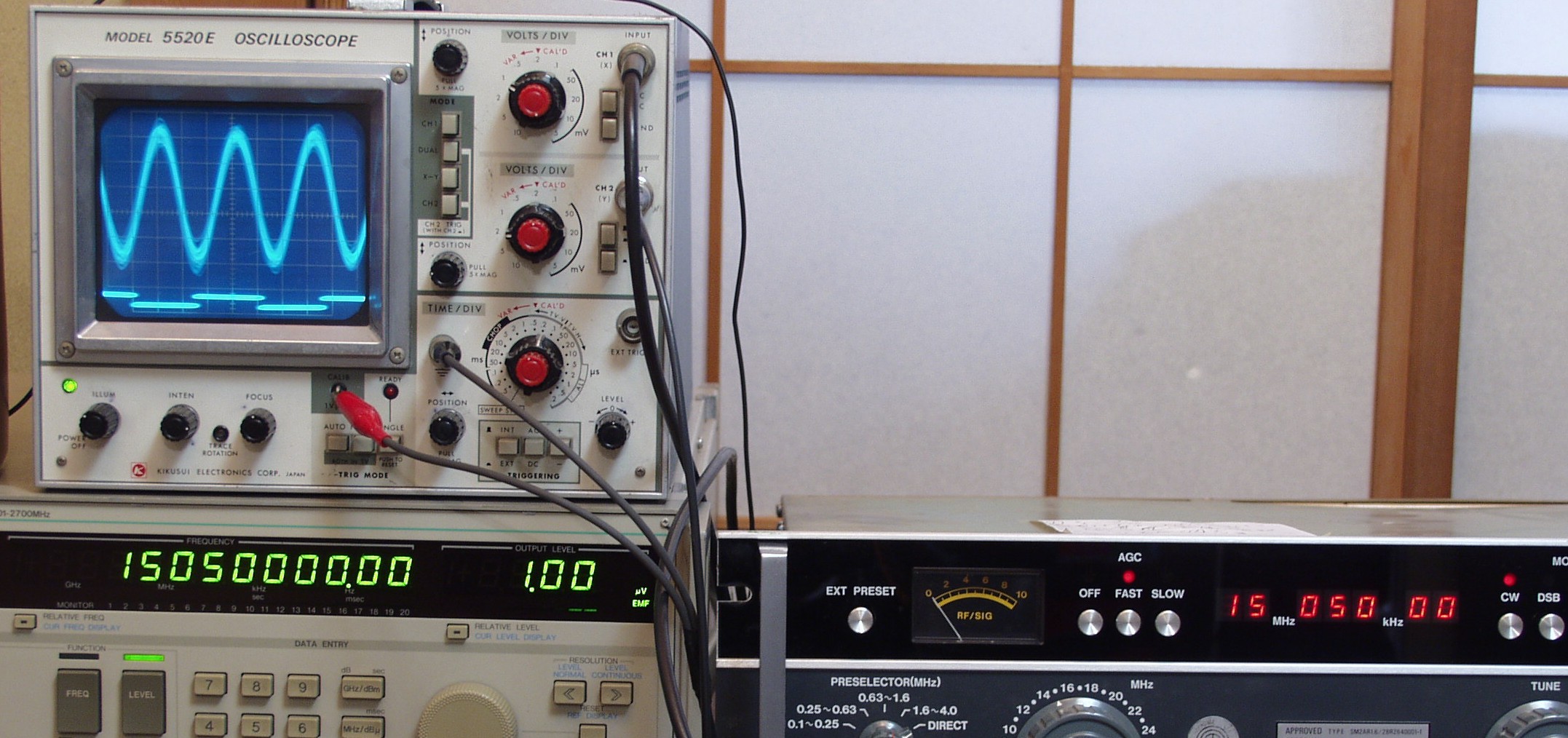 | F. 上位測定機器での調整・測定 KEN WOOD TS−940の測定は此方に有りますので比較して下さい F−1. 15MHZ感度測定 SSGより15.05MHZの1μVの信号をCWで受信 BFOを1KHZに調整して、SP出力を測定 |