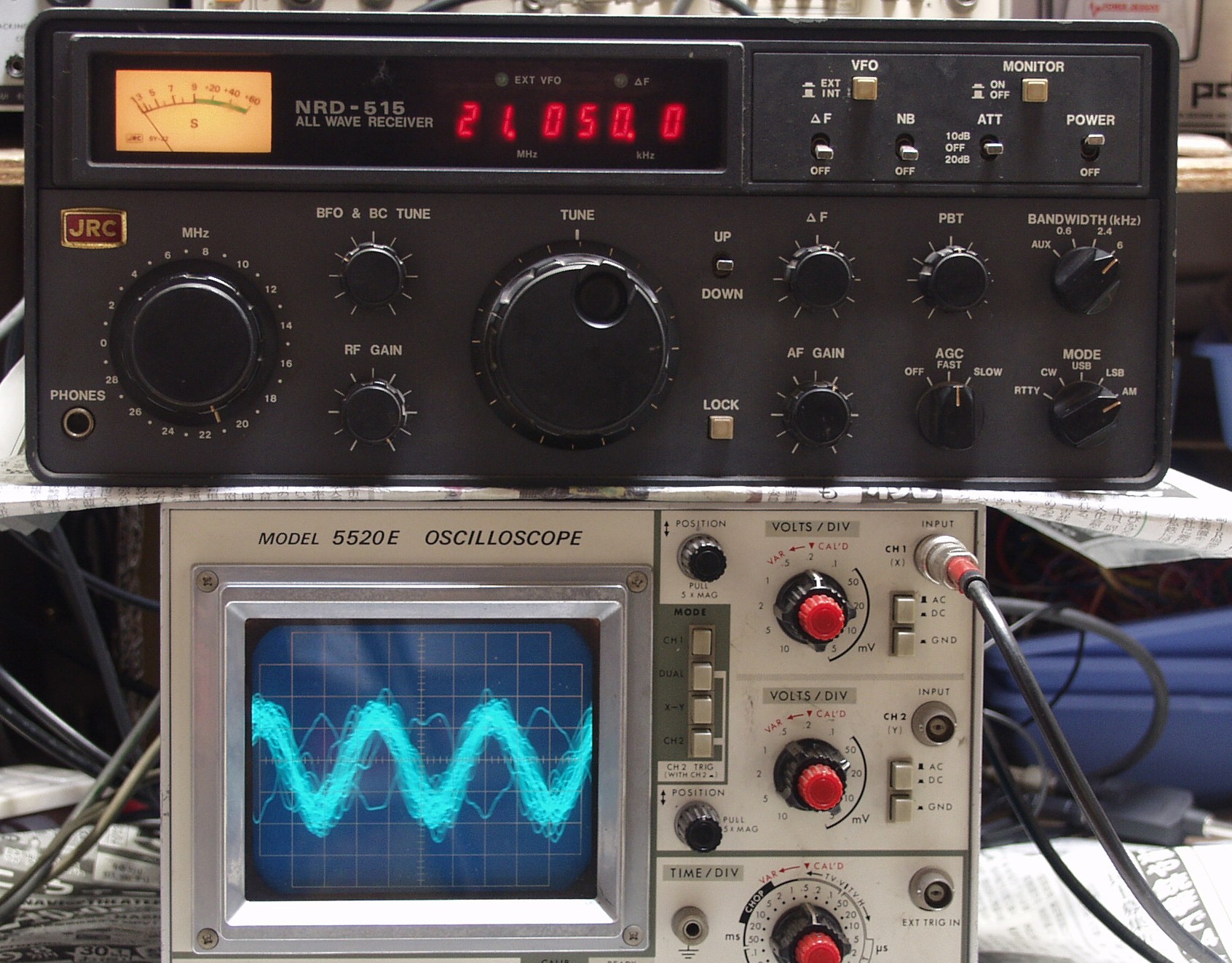 E−1. 測定・調整 上のSGより400HZAM50%変調の信号を受信し、ライン出力をオシロで観測、信号強度=2μV |
