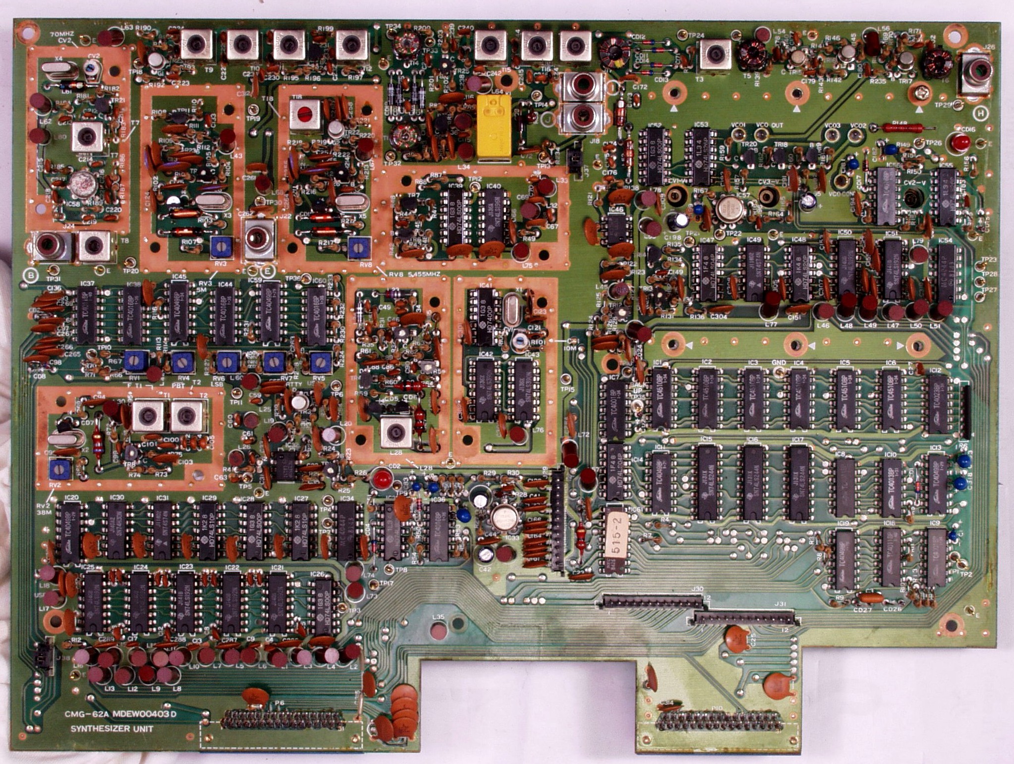| C−6B. 修理中 シンセサイザー基板、シールドを外した所 |