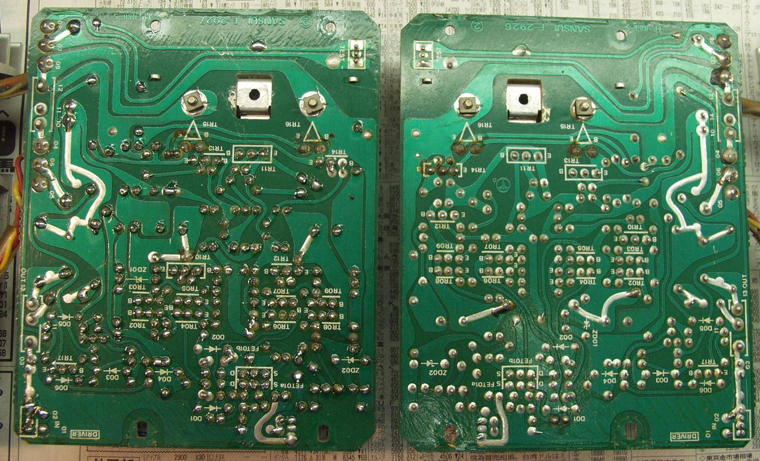 | 2.終段ドライブ基盤、左=修理後、右=修理前 |